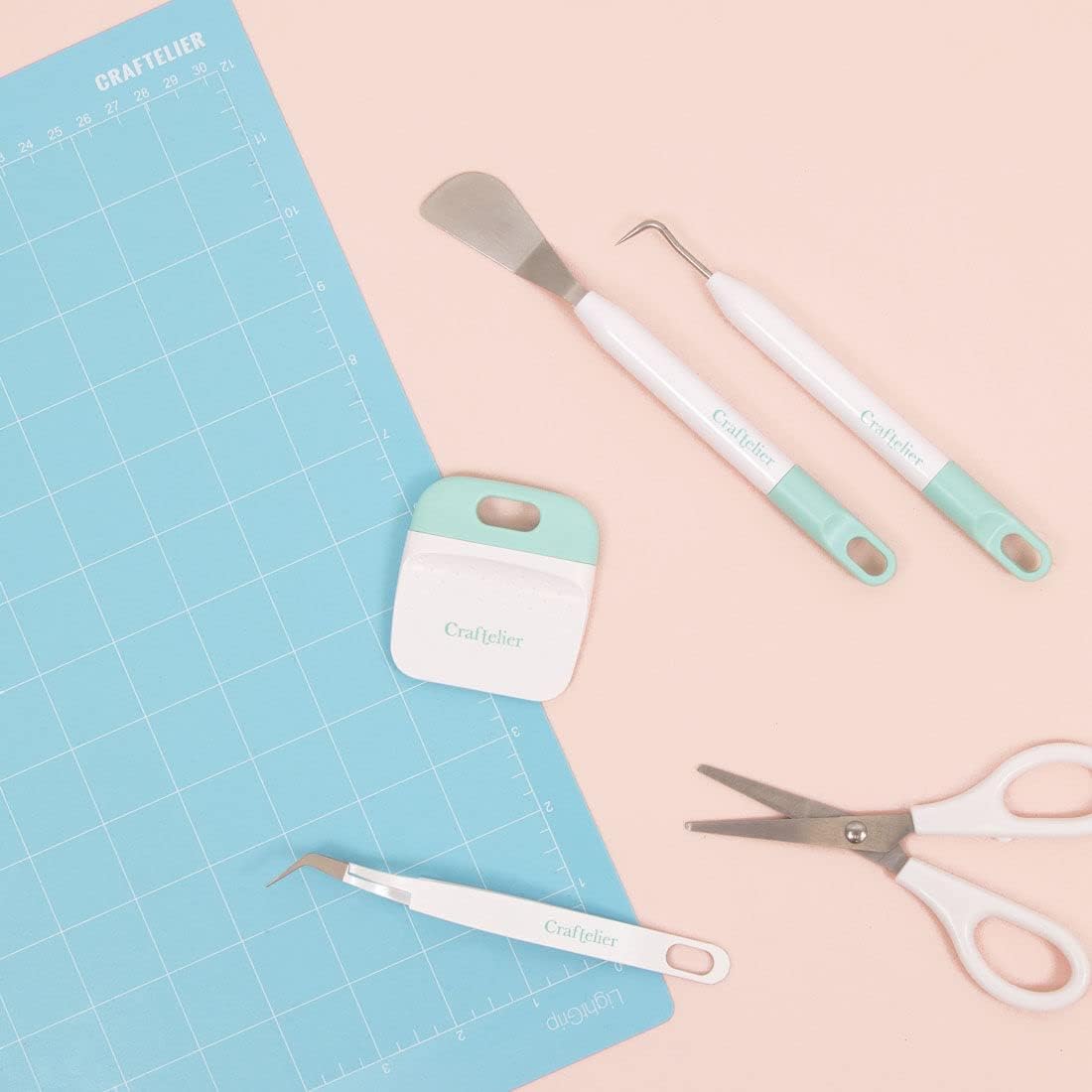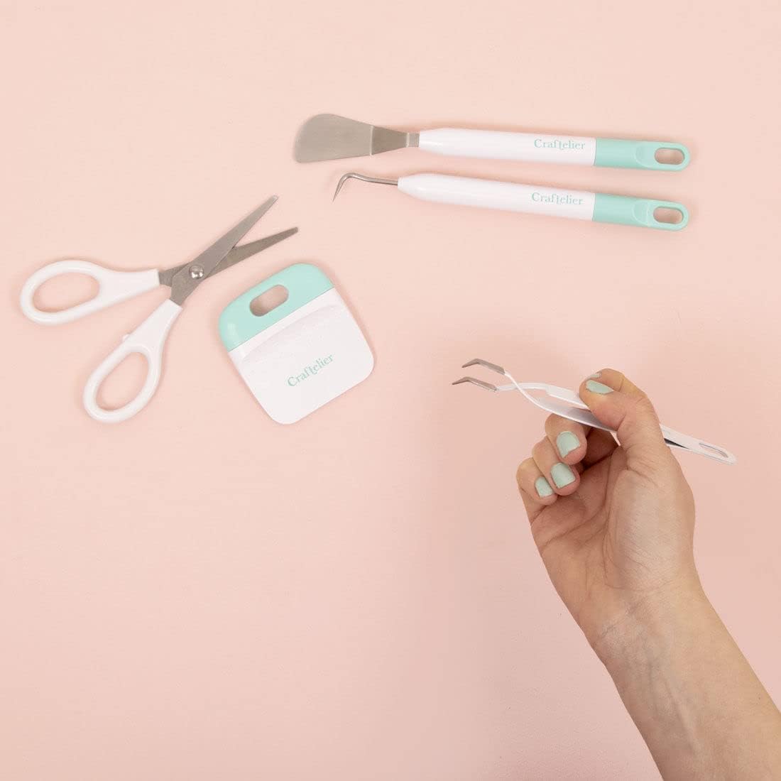 Craftelier – Set of 5 Basic Tools for Various Scrapbooking and Crafting Materials Such as Vinyl and Paper | Scissors, Spatula, Hook, Scraper and Tweezers | White and Turquoise Colour