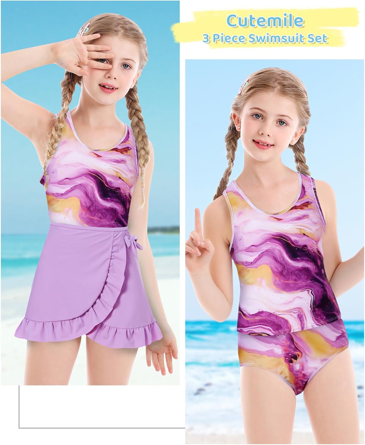 Cutemile Girls Swimsuit 3 Piece Bathing Suit Quick Dry Tankini Set with Cover Up Beach Skirt Bikini Swimwear 6-12 Years