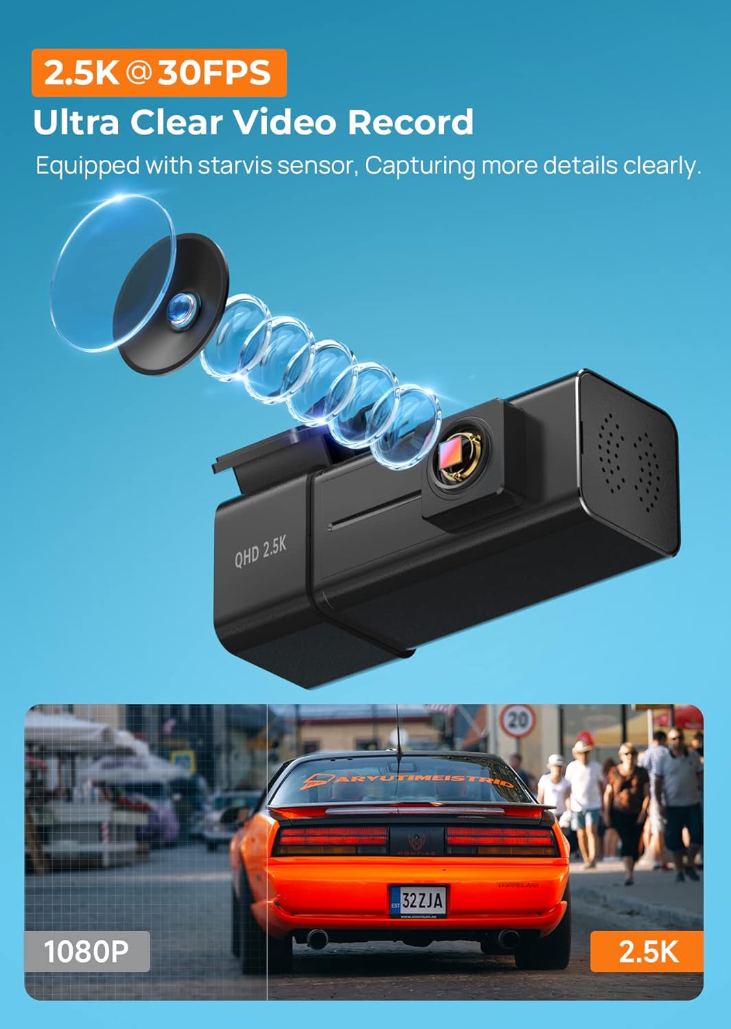【2.5K Clear Recording】Experience top notch video quality with the V100 dash cam. Featuring an advanced Starvis sensor and 6 glass lens, it captures your drives in stunning 2560*1440P resolution, offering 70% more pixels than standard 1080P. The 160° wide angle lens min blind spots and easily covers up to 4 lanes. With Super Night Vision technology and an F1.8 large aperture, the dashcam for cars increases light intake by 30%, ensuring get clear and detailed footage even in low light condition.