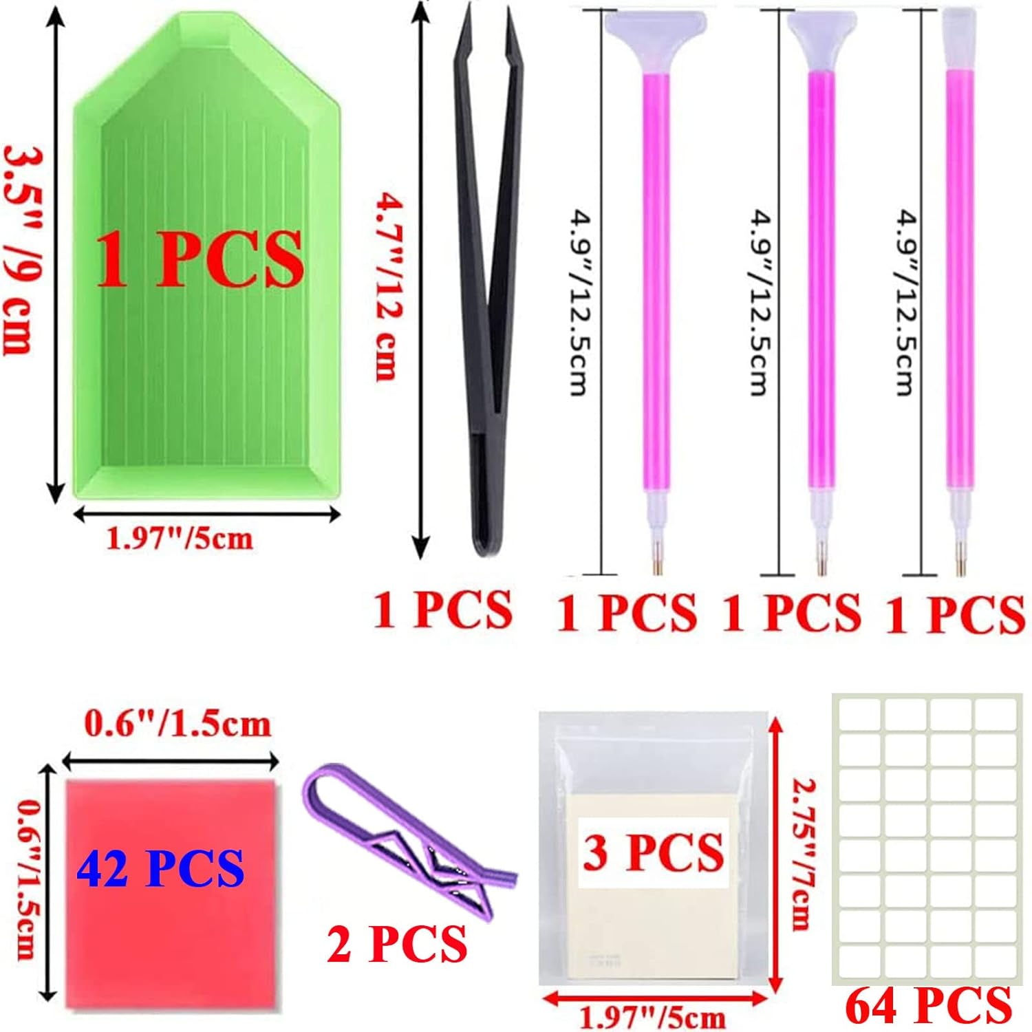 Diamond painting tools material: silicone and plasticDiamond painting glue size: about 2.0 x 2.0 cmDiamond art pens length: about 10 cm to 15 cm longQuantity: 3 PCS diamond stitch dot pens + 3 PCS small sealed bags for diamonds + 64 PCS label number sticker for diamond painting beads + 42PCS diamond painting glue clay+ a metal tweezer for diamond dots + 2 PCS non-slip paint clips + a plastic diamond painting trays