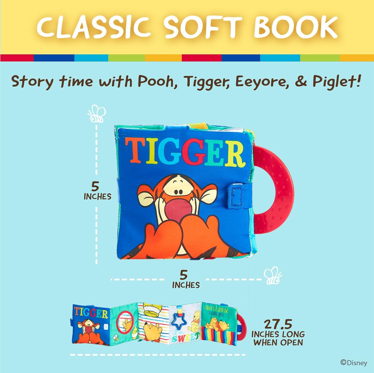 CLASSIC STORYTIME: Help baby to learn & begin story time with a soft fabric book featuring Pooh, Tigger, Eeyore & Piglet. An adorable 5 inch on-the-go book lets baby play as you read a story together.
