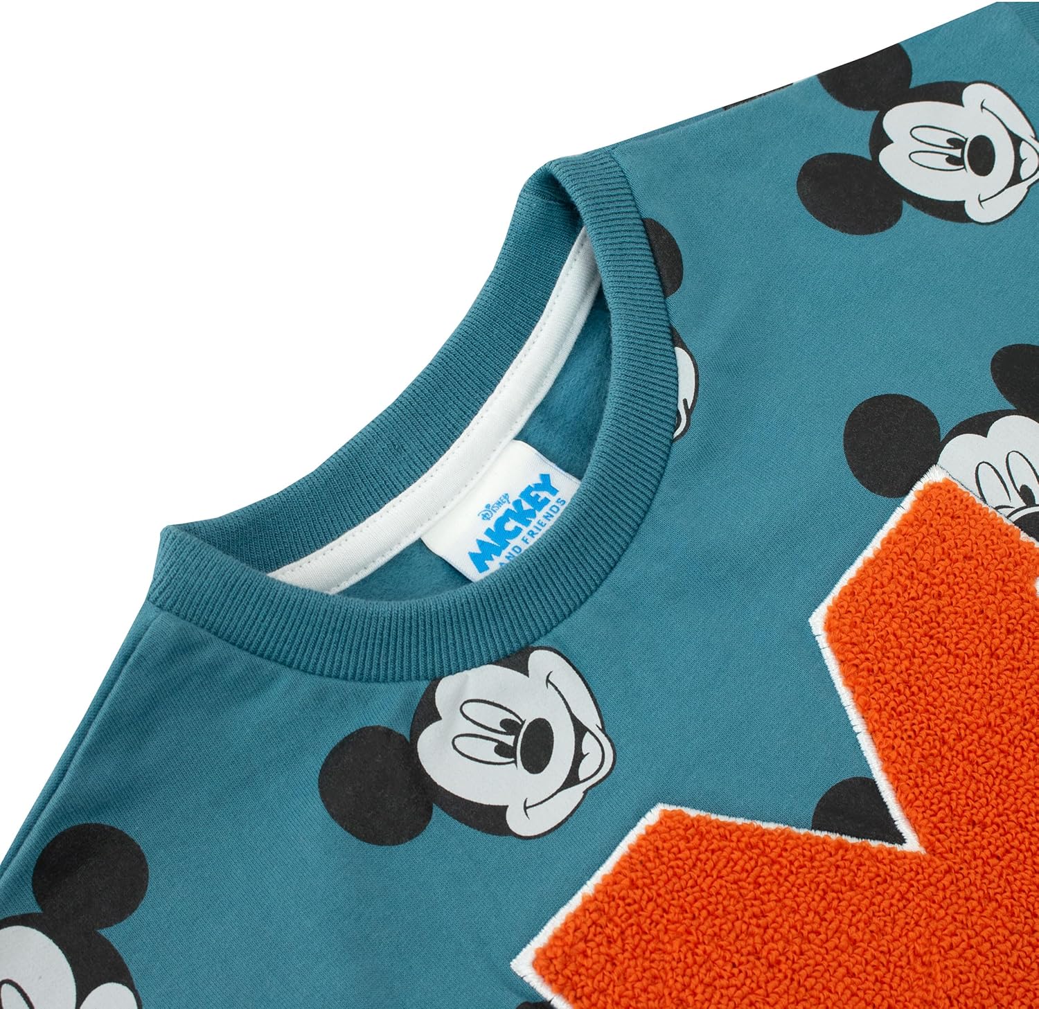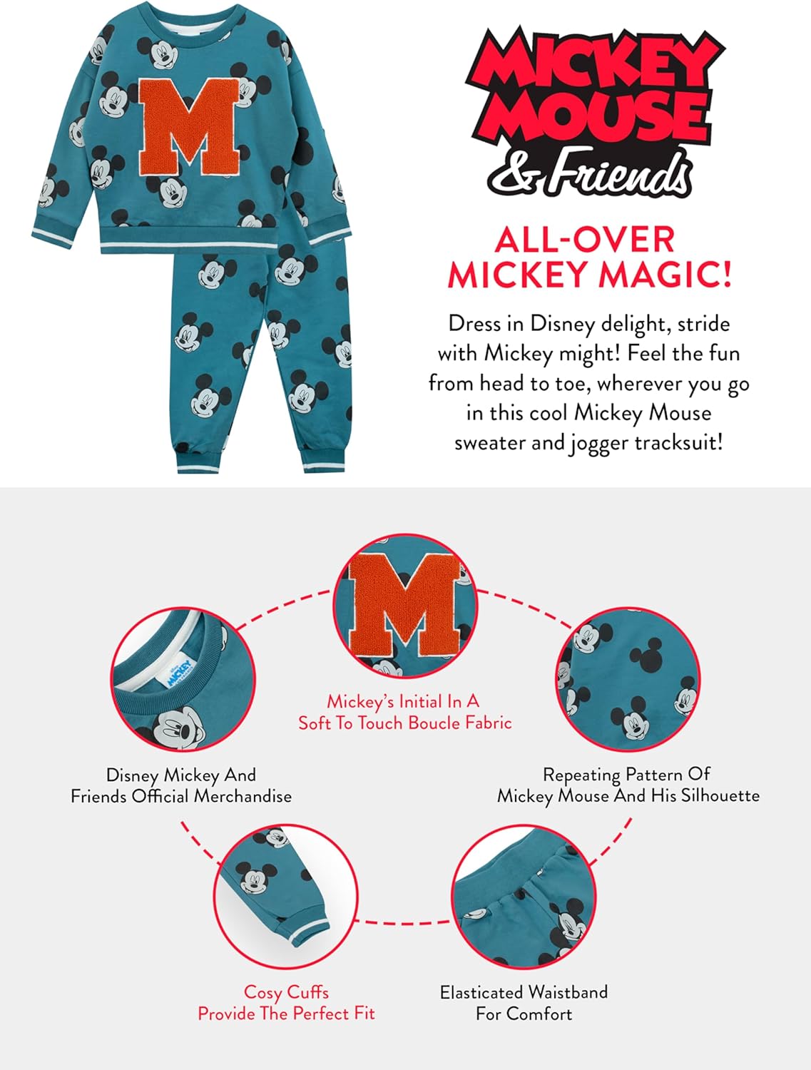 Step into a world of wonder, where dreams and play intertwine, with our Mickey Mouse Joggers and sweatshirt set for Boys! Immerse your little one in the enchanting realm of Disney, wrapped in the vibrant teal hues of this Mickey Mouse costume. Every inch bursts with Mickey’s iconic charm, from the captivating all-over print to the striking red ‘M’ patch that proudly adorns the disney jumper. The perfect Mickey Mouse clothes boys will adore. Designed for both comfort and style, this two piece sets is meticulously crafted from 100% pure Cotton, ensuring your child is cocooned in utmost comfort. The elasticated cuffs on both the disney sweatshirt and joggers promise a snug fit, making it more than just boys clothes – this boys tracksuits is an experience of joy and comfort. But there’s more! This isn’t merely a Mickey Mouse jumper and bottoms set; it’s a coordinated fashion statement. The seamless design synchronization between the disney top and the joggers adds a layer of charm, making your little one stand out in any gathering in these disney clothes for boys. And the magic doesn’t stop there. This is not just another matching sets from the vast realm of children’s clothes boys have access to. This is official Mickey Mouse disney clothing, blending the timeless elegance of Disney with contemporary clothes for boys design. If you’ve been on the hunt for the perfect gifts for boys, be it boys birthday presents, Disney gifts, Christmas Mickey Mouse delights, or just something to add to their micky mouse collection to go with the rest of their Mickey Mouse clubhouse toys and disney toys, this disney jumpers and joggers set is your answer. Gift the magic of Mickey, and watch their eyes light up with unbridled joy!