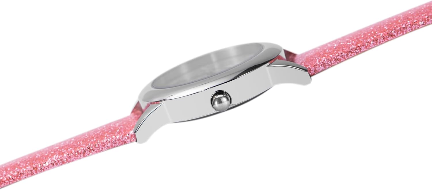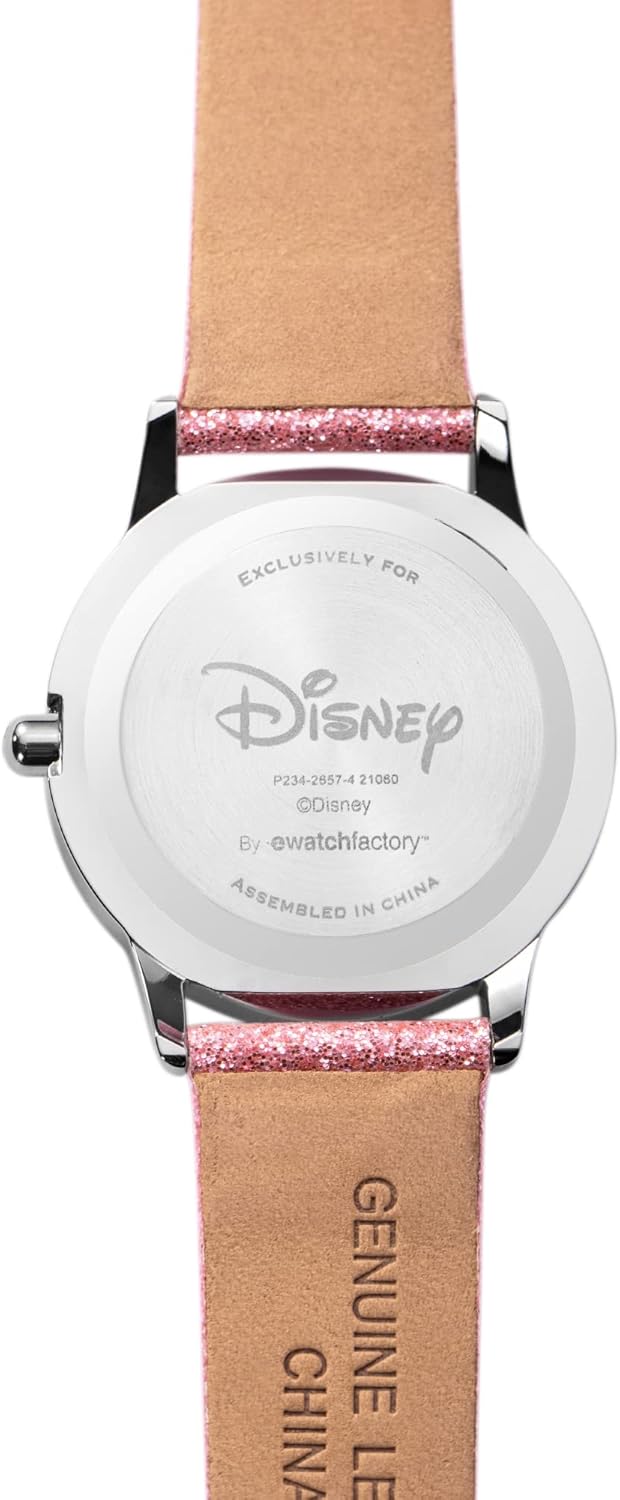 Disney Minnie Mouse Girls’ Stainless Steel Time Teacher Watch. 32mm Plain Stainless Steel case, 16mm Pink Glitter Strap, dial features Minnie Mouse. Mineral glass crystal, stainless steel case back, Japan quartz movement, water resistance to 100 feet.