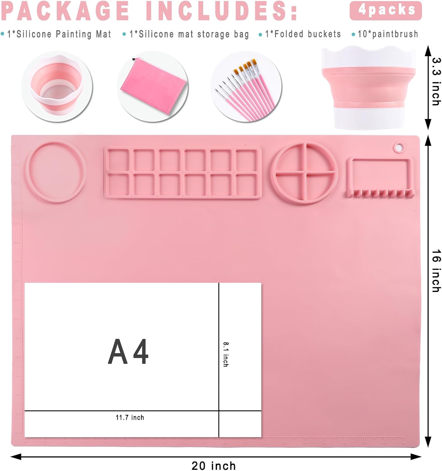 【Large Silicone Mat】 You will get a large silicone craft mat, size is 20X16 inch, with brush washing bowl, 10 painting brushes and large waterproof storage bag, The accessories are sufficient to meet the needs of most DIY enthusiasts and art creators.