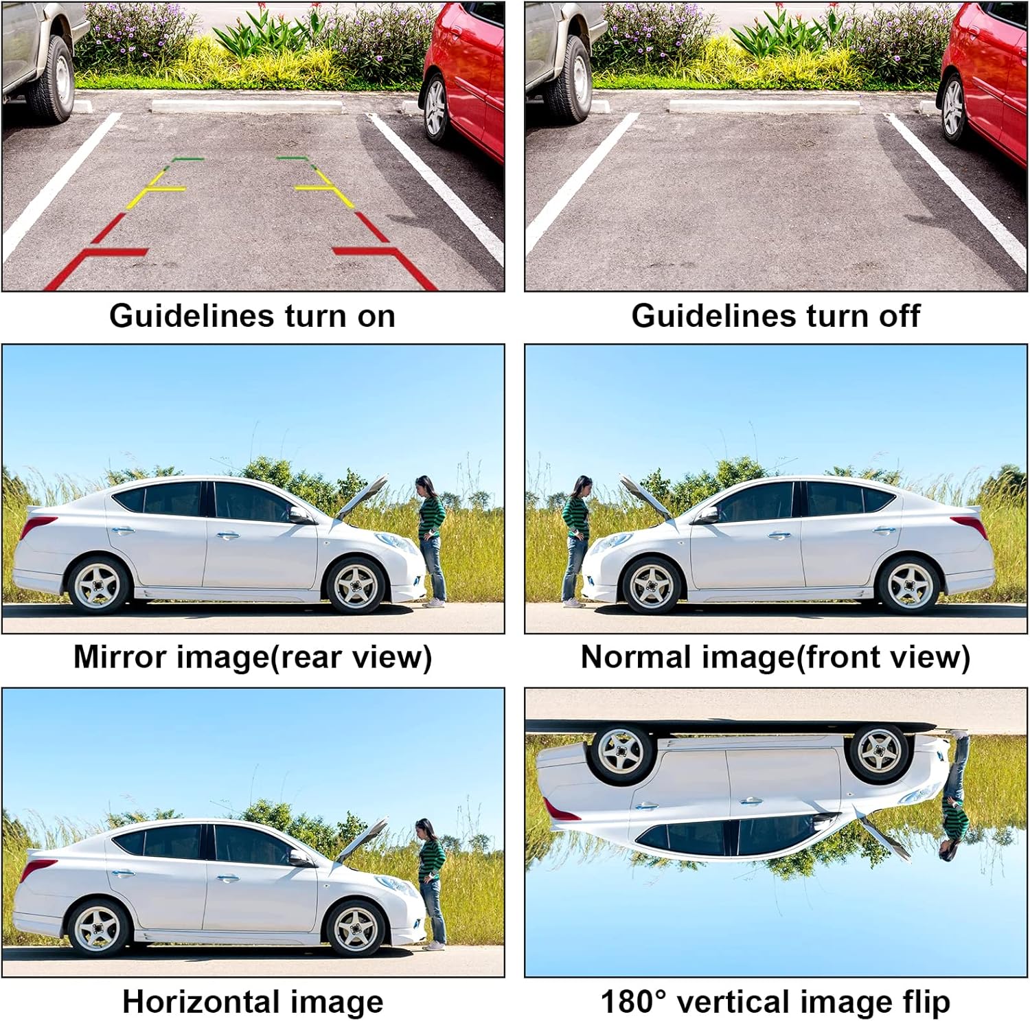 Cut green wire will close the parking guide lines ( default with guide lines); Cut blue wire will flip the image 180 degrees; Cut the white wire will switch image to facing front view (default is mirror rear view).