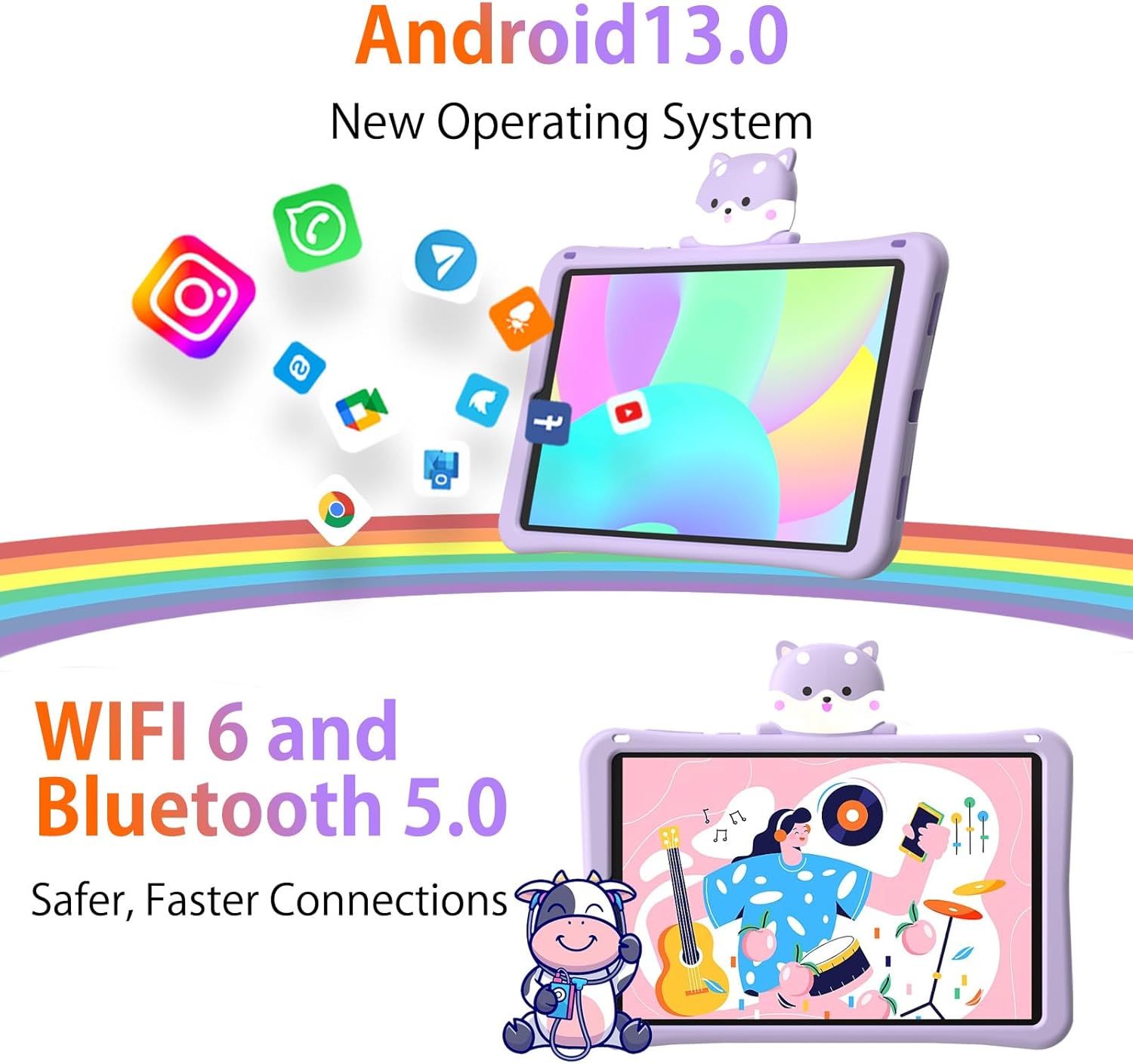 【Generous 128GB Storage Capacity+ Dual Camera】The Android 13 Tablet PC features memory expansion technology with 9GB RAM (4GB +5GB virtual memory) to make games and multitasking smooth. With 128GB of internal storage and support for storage expansion up to a massive 1TB, you’ll never run out of space for your child’s favorite content. Small tablet boasts a high pixel 13MP rear camera and an 5MP front camera, capturing breathtaking photos and delivering crystal clear video calls.