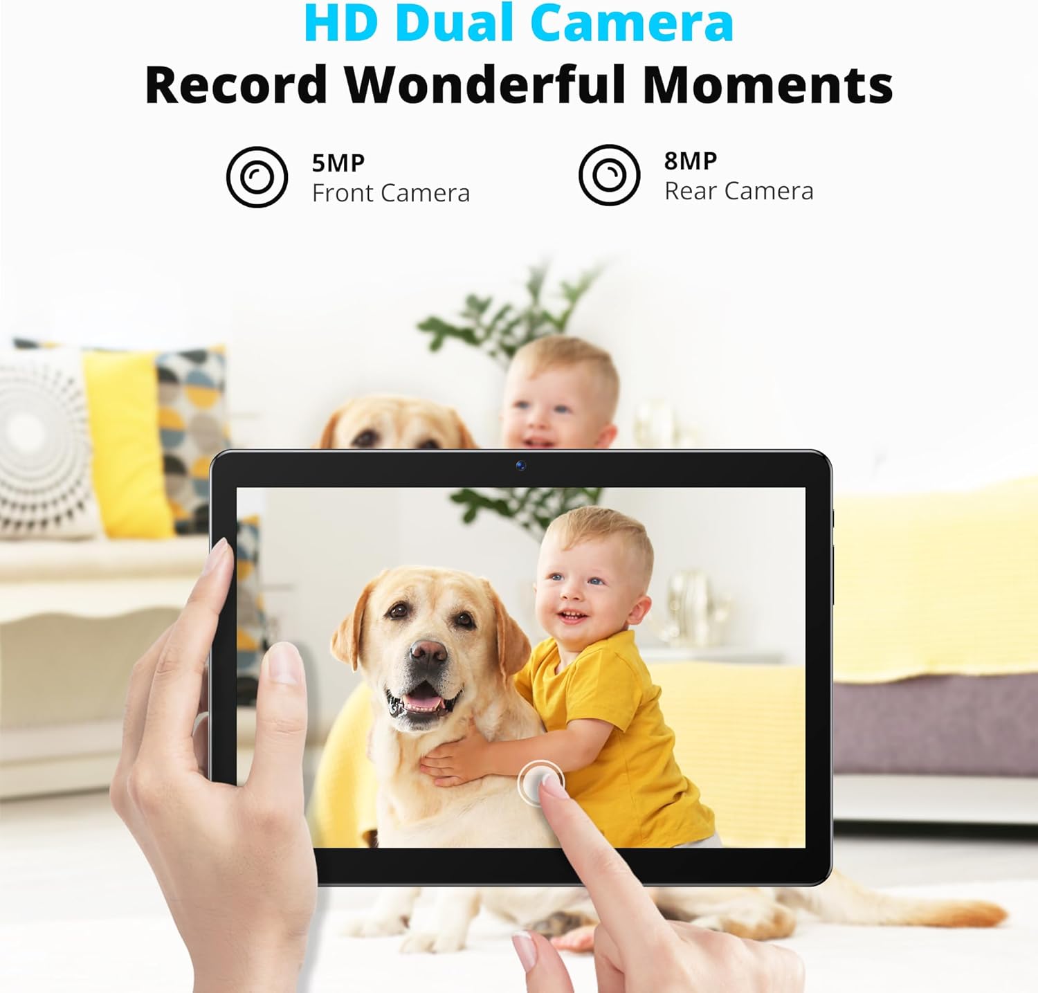 Slim Body, Room for Everything: This 10-inch tablet has built-in 32GB memory and supports up to 256GB microSD cards to expand the storage. You can download and keep your favorite books, songs, photos, movies, and games, everything you like in this slim metal android tablet.