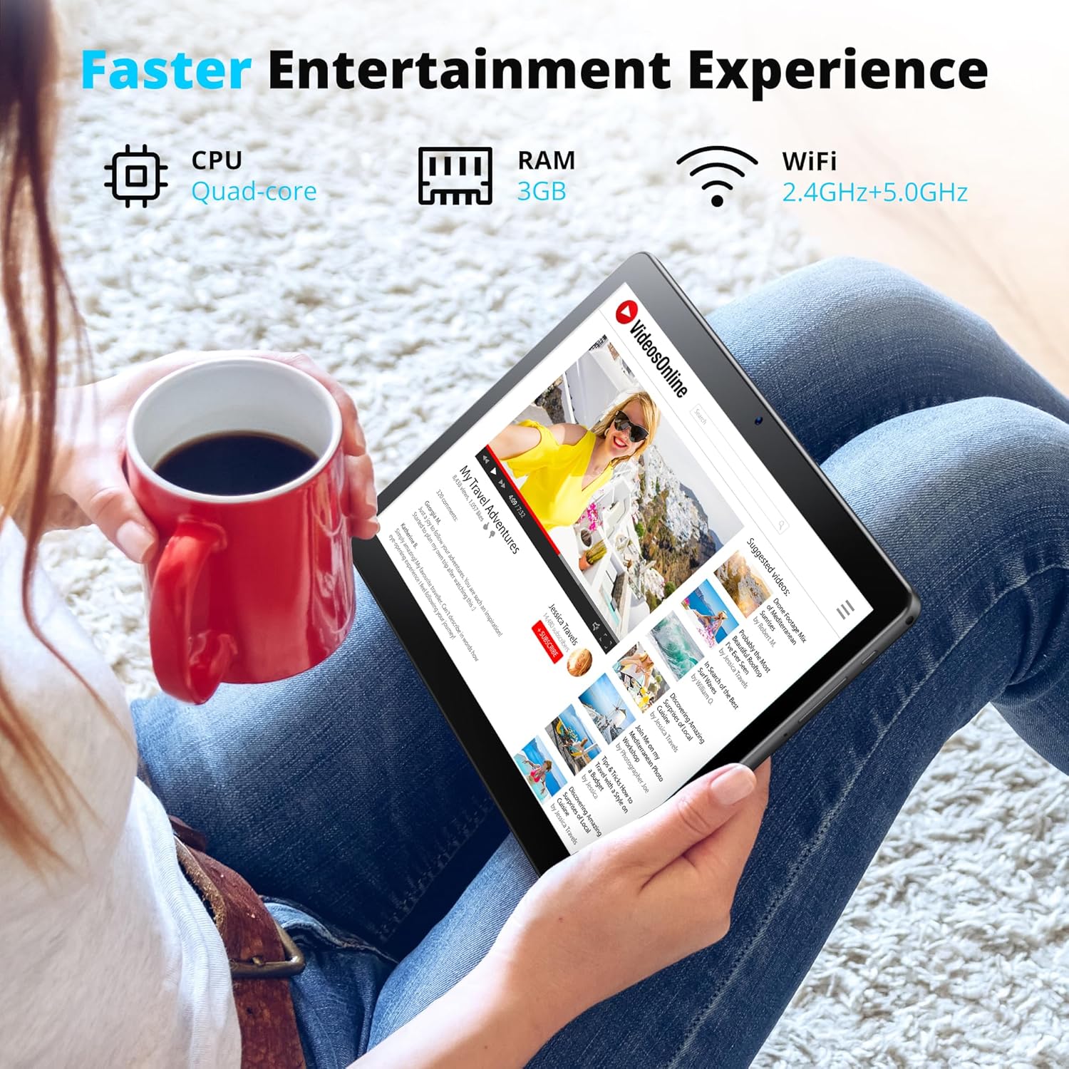 Powerful Tablet for All: This tablet is a 10 inch Wi-Fi android tablet with GPS capability. It is powered by a 64-bit quad-core high-performance processor with 3GB RAM 32GB storage, providing a superior experience of entertainment, browse, games and shopping for everyone in the family.