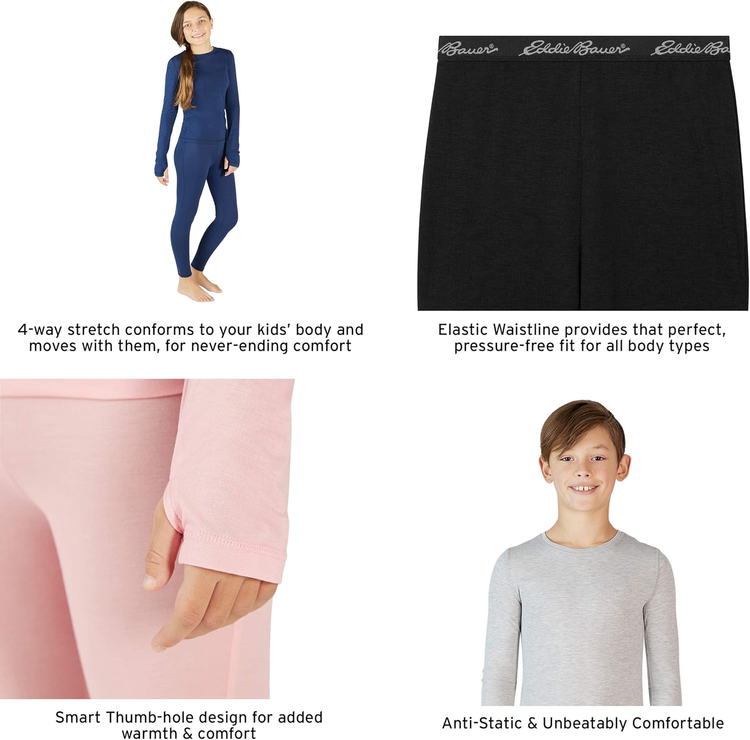 Invest in an Eddie Bauer Thermal Underwear Set & Grant Your Kid the Comfort & Warmth They Need Even During the Coldest DaysAsk anyone accustomed to living in a cold climate what the secret to staying warm is, and you’ll invariably get one answer layeringEspecially if your little ones love skiing, snowboarding or any other amazing winter sport, keeping them warm and protected against the cold is the #1 thingWith this base layer thermal underwear set with long sleeved shirt and pants, you can finally be sure your young explorers will be covered from head to toe with the most protective and comfortable cold defying clothesPremium Kids’ Layering 2 Piece Set The Best Thermal Underwear for Active Boys & GirlsWhether at home, at school, at playdates, or even at sports and activities, these cold weather base layer underwear garments are the perfect way to keep any child warm, dry and comfortableNot only do the long sleeved shirt and pants retain heat and add a layer of insulation to your kid’s clothing, but they also allow free movement, wick sweat and moisture away, and dry very quickly!Designed & Made From the Ground Up for Children & Their Everyday Active Lives