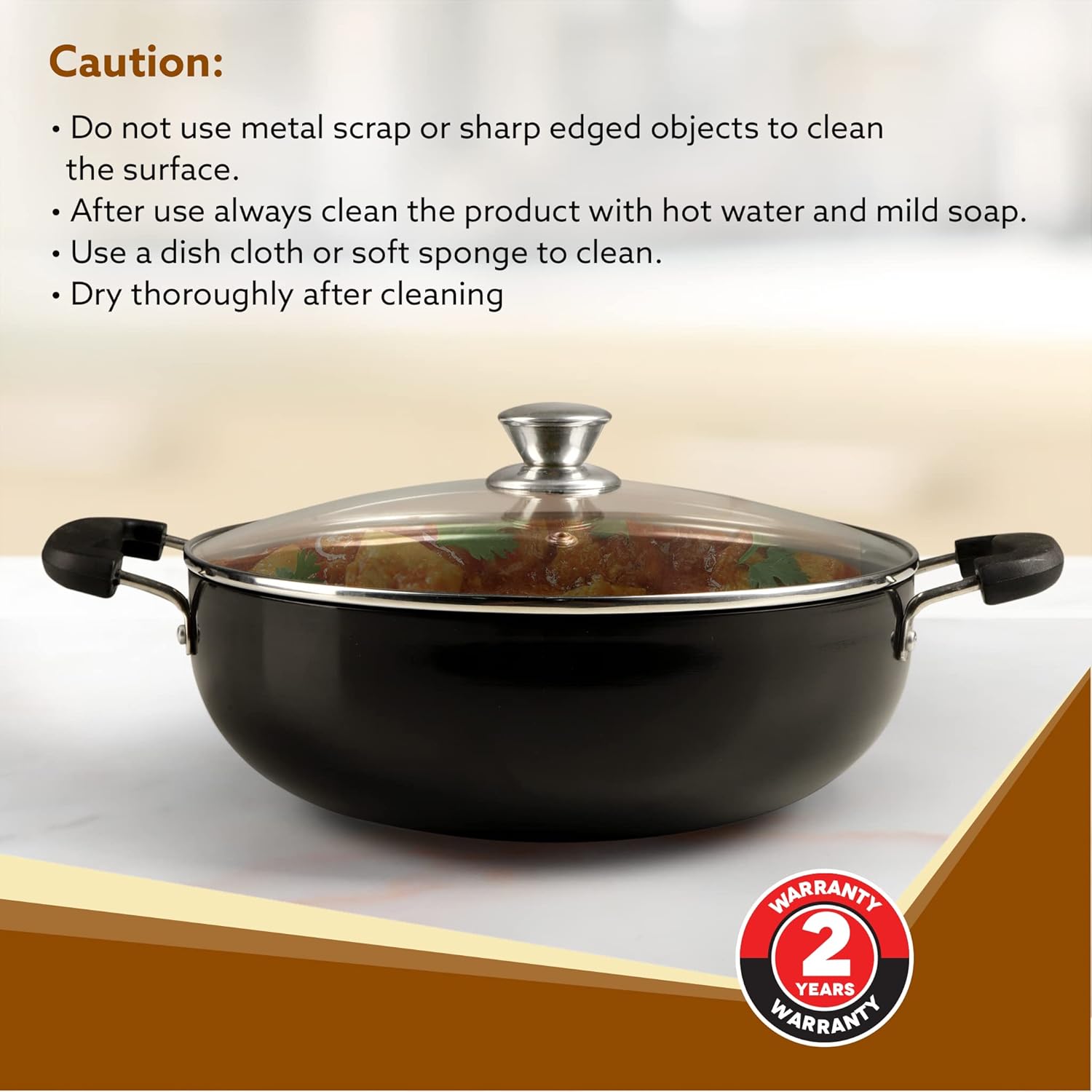 Caution: Do not use metal scrap or sharp edged objects to clean the surface After use always clean the product with hot water and mild soap. Use a dish cloth or soft sponge to clean. Dry thoroughly after cleaning