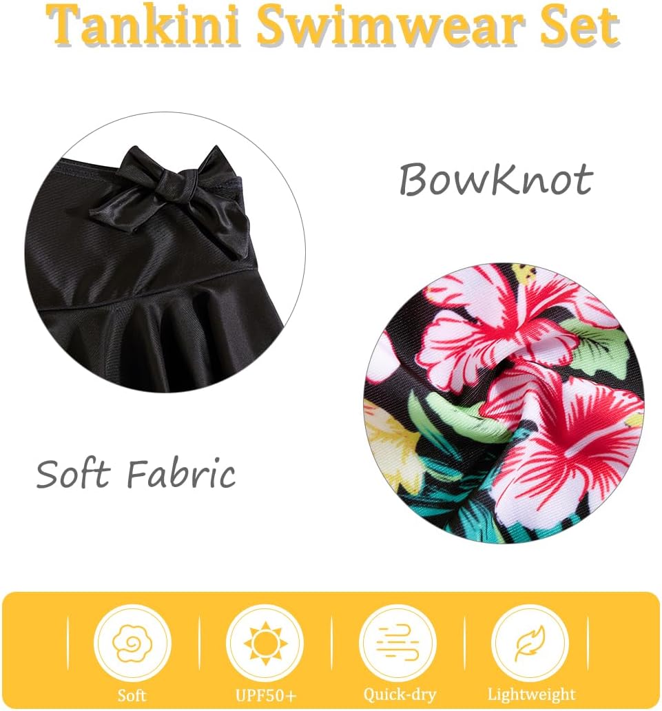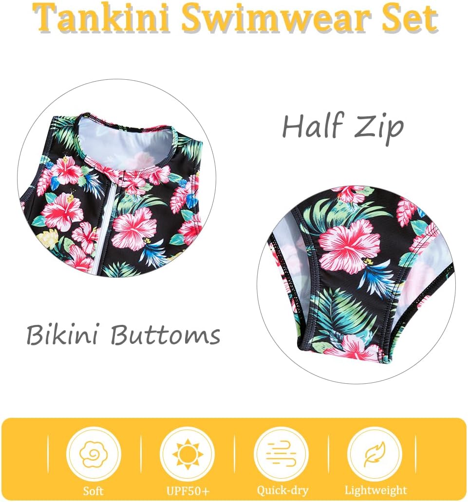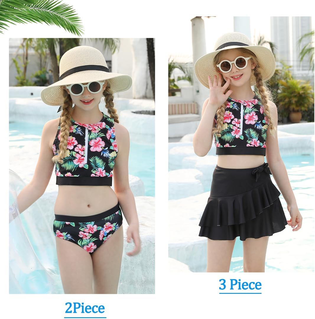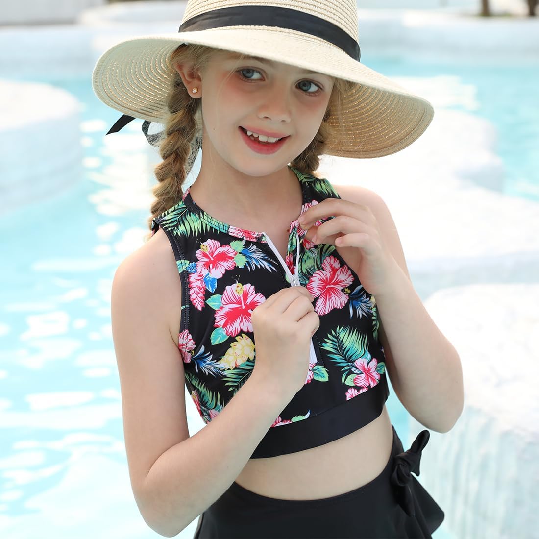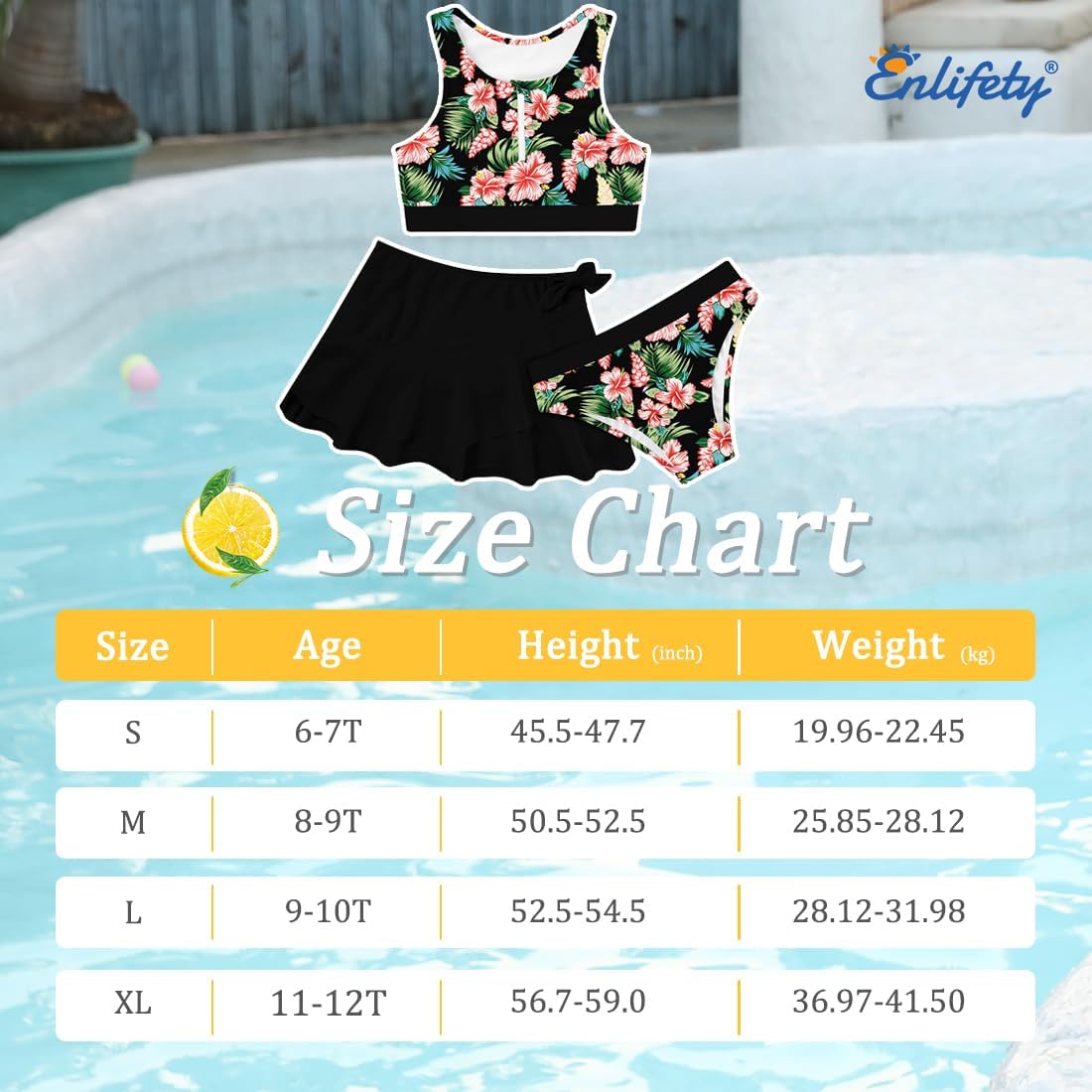 Enlifety 6-12 Years Girls Swimsuit 3 Piece Tankini Bathing Suit Zipper Swimwear Set with Cover Up Beach Skirt