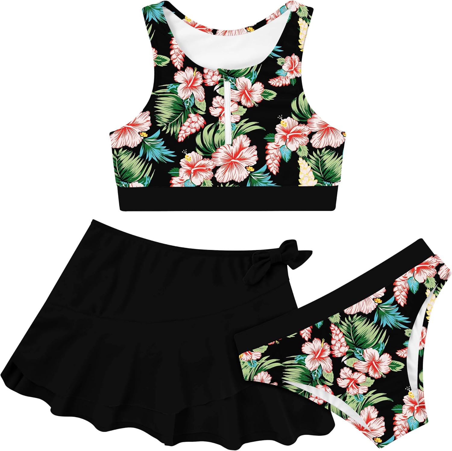 Enlifety 6-12 Years Girls Swimsuit 3 Piece Tankini Bathing Suit Zipper Swimwear Set with Cover Up Beach Skirt