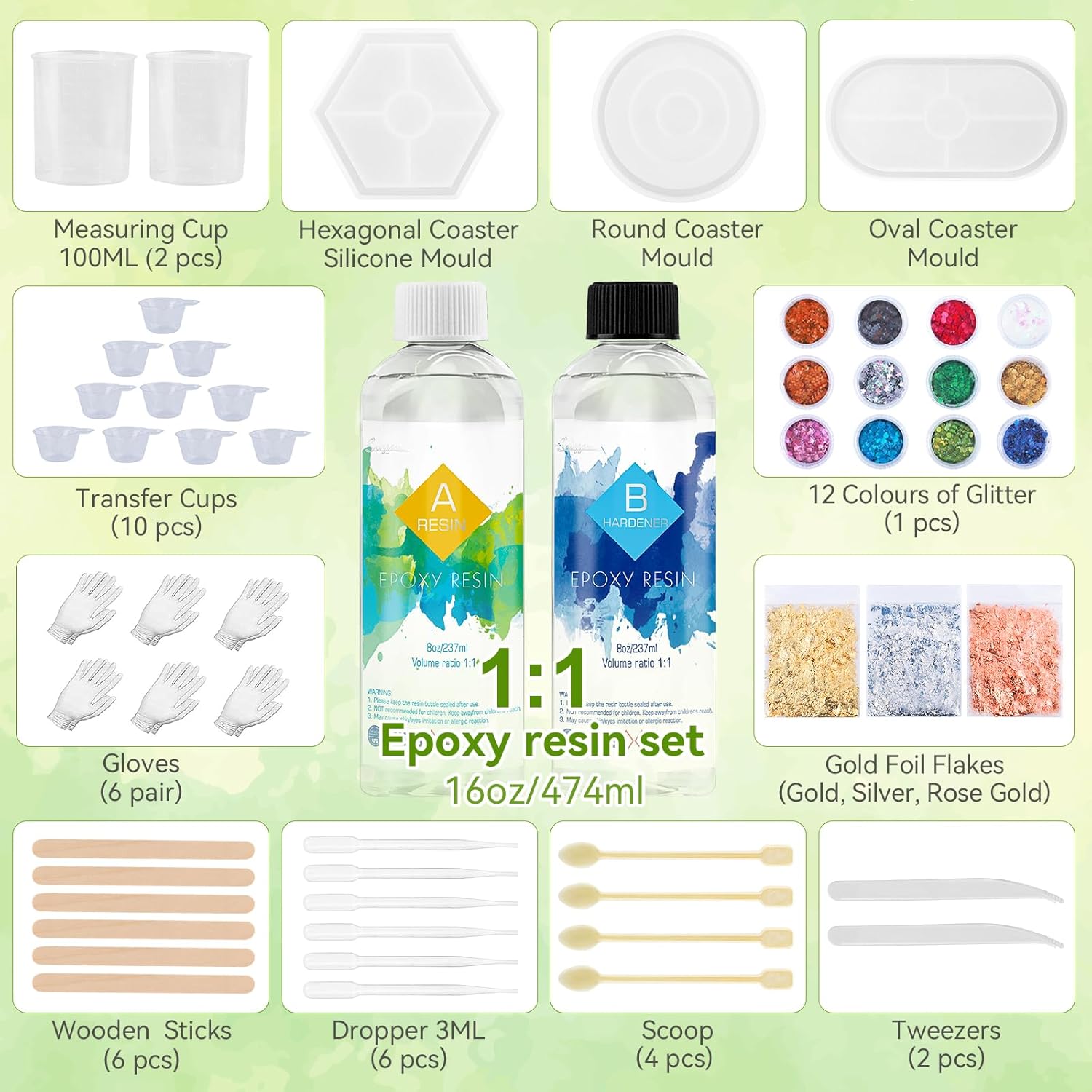 【QUALITY SERVICES】To facilitate your immediate creation, we offer a resin kits and molds complete set: 2 pcs measuring cups 100ml, 10 pcs transfer cups, 6 pcs transfer pipettes 3ml, 6 pcs wooden sticks, 6 pairs of gloves, 12 colors of glitter, 4 pcs scoop, 2 pcs tweezers, 3 pcs gold foil flakes, 3 pcs coaster silicone mold. If you have any questions, please feel free to contact our team!