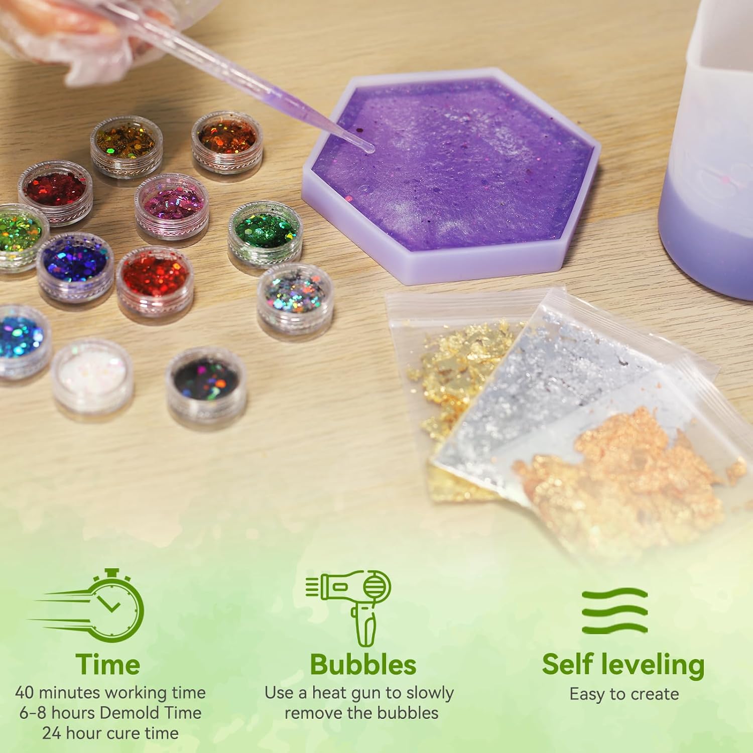 【EASY TO USE】Working time in the greenhouse is up to 40 minutes, curing time is up to 24 hours, hardness after curing is up to 80D, anti-scratch, anti-yellowing, effectively protect your handmade works, epoxy kits are suitable for parent-child family projects, making DIY gifts, artistic creations and more!