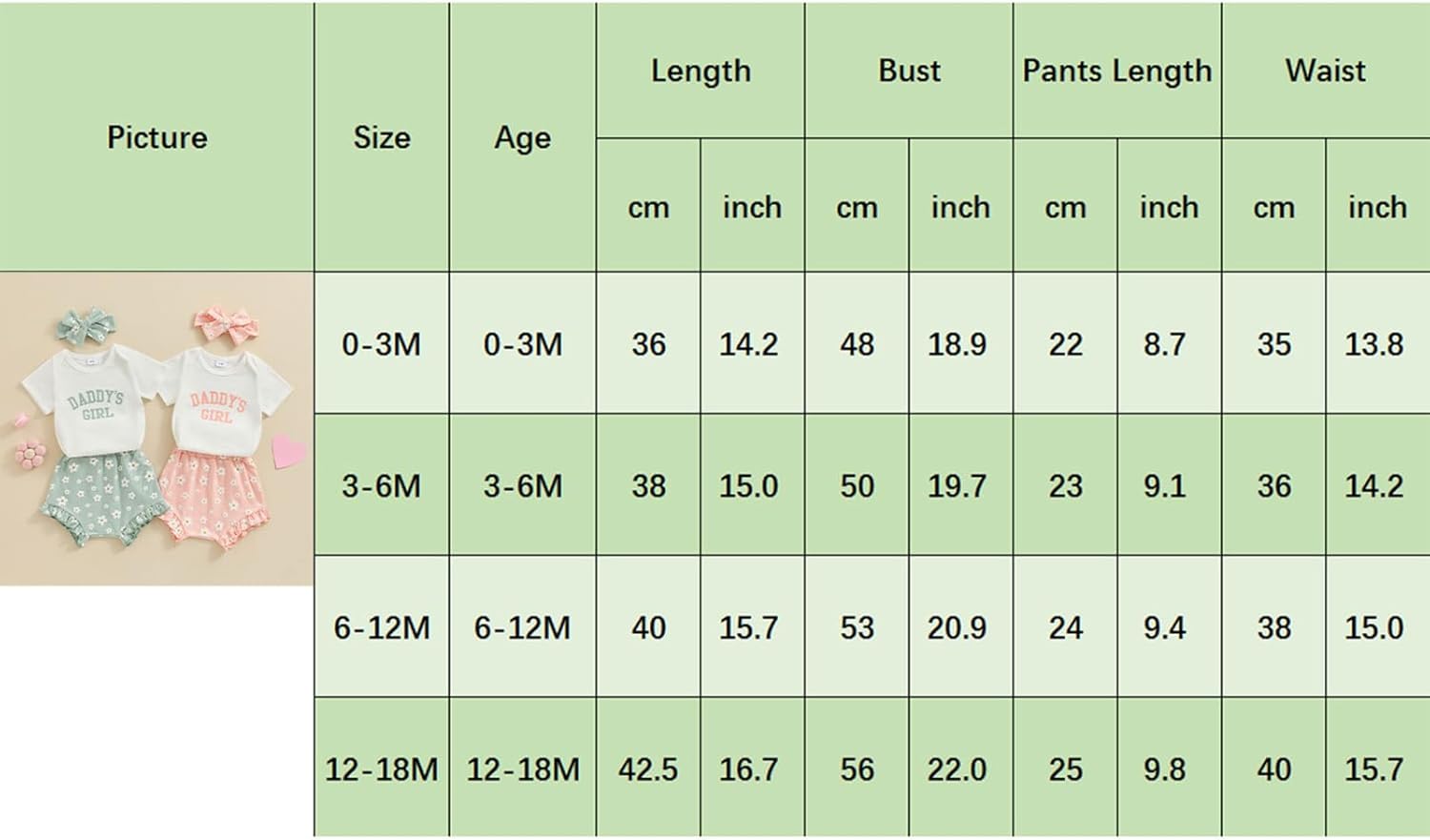 0-3M Tops Length: 14.96 Bust: 18.9 Pants Length: 8.07 Advised Age: 0-3 Months