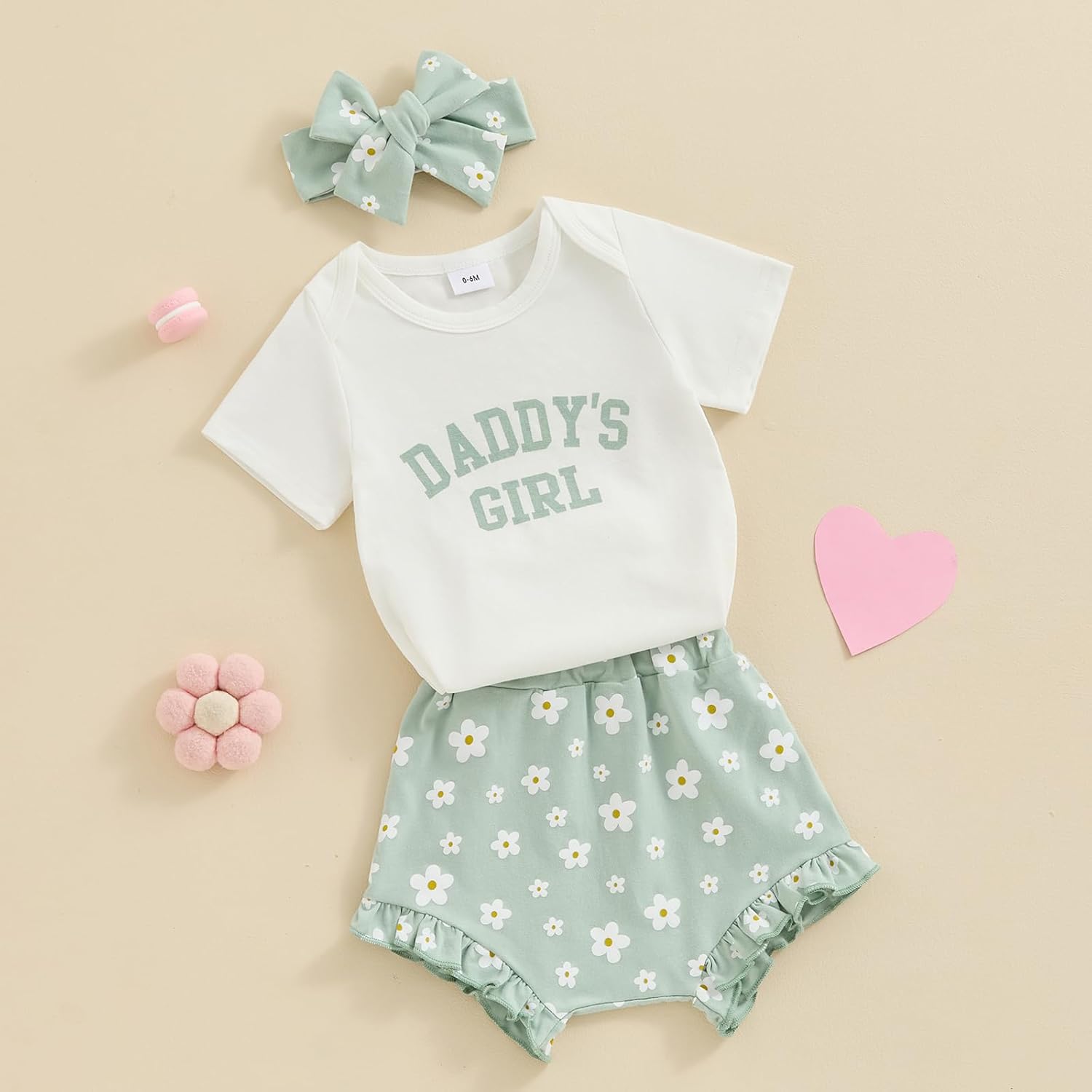 Baby Girl Summer Outfit Ruffled Short Sleeve Letter Romper with Floral Tiered Ruffled Shorts and Headband