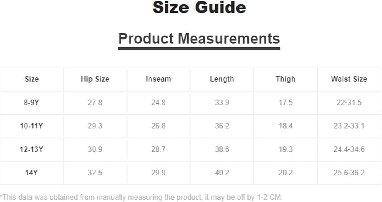 9 Years: Hip Size: 27.8″, Inseam: 24.8″, Length: 33.9″, Thigh: 17.5″, Waist Size: 22-31.5″