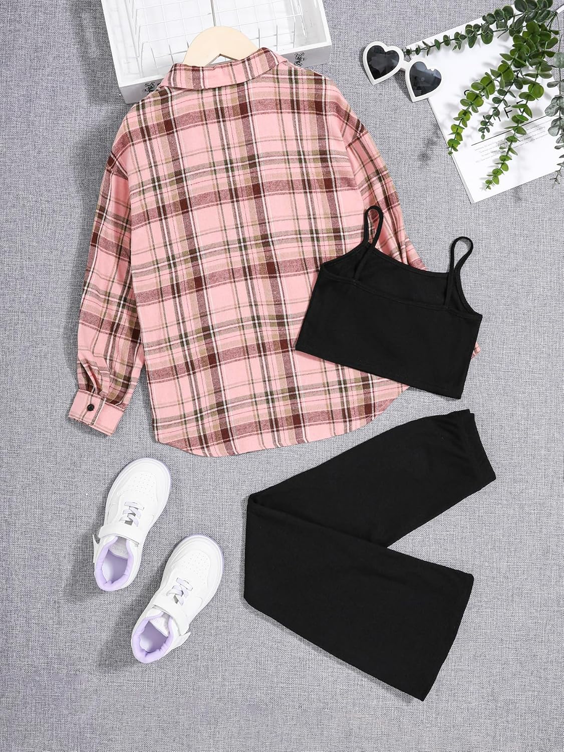 Floerns Girls 3 Piece Outfits Bell Bottom Outfit Cami Top and Flare Pants Set with Plaid Print Shirt