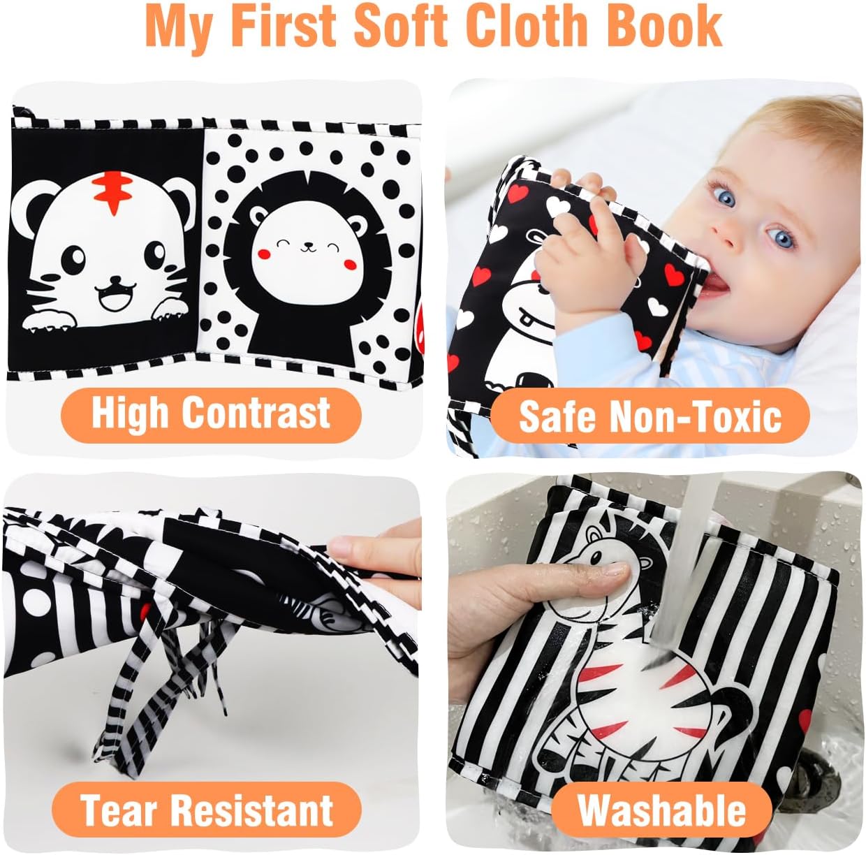 👼【Enhanced Baby Visual Stimulation】Our double-sided design baby black white book comes with crinkle paper and bi-bi sounder hiding in the pages, research shows 0-3 months baby toys help your baby develop their ability to focus and concentrate. Black and white baby toy is not only aids babies’ early visual development but also stimulates newborns’ brain development.