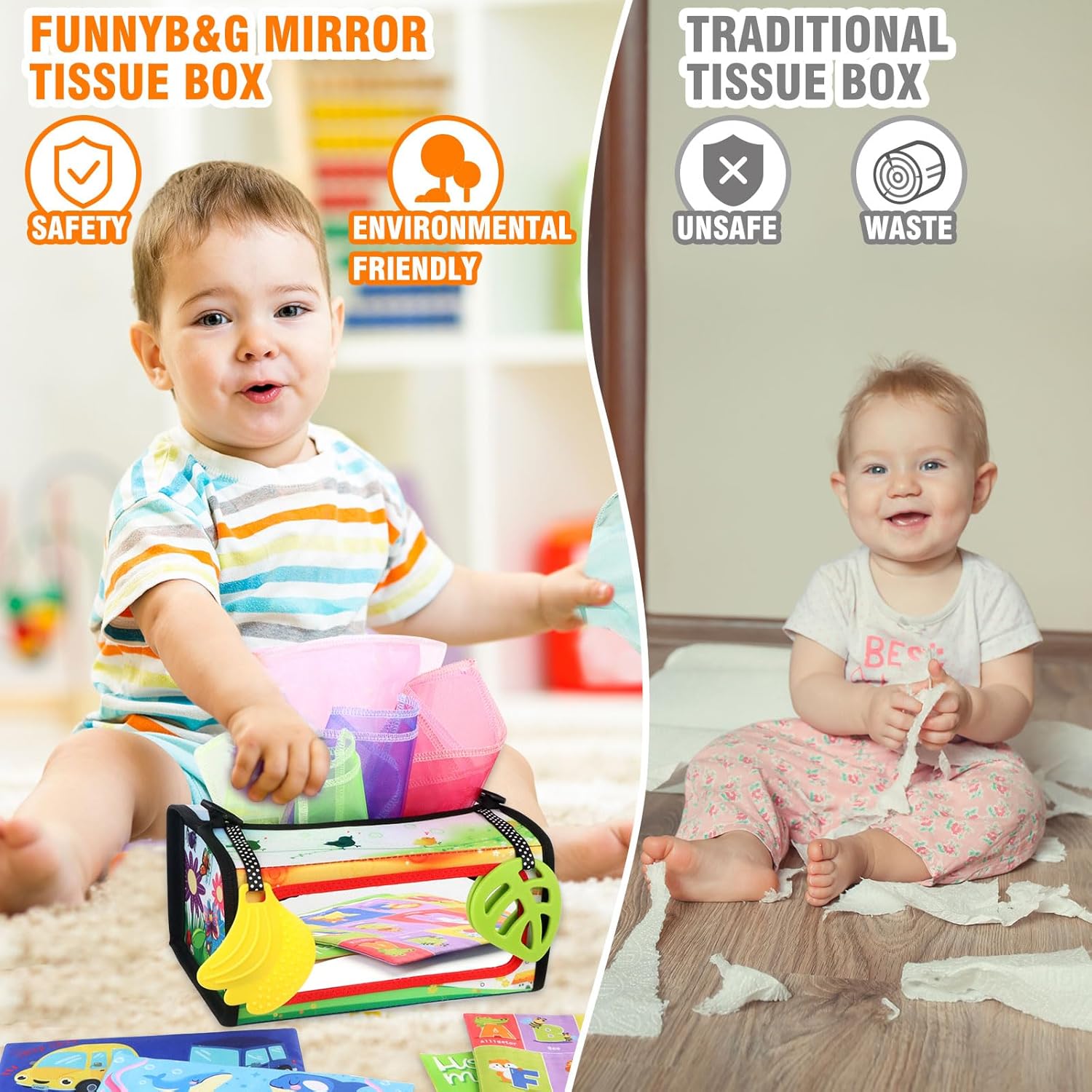👶【2 In 1 Baby Tummy Time Toys】Compared to other tissue box toys or baby tummy time mirrors on the Amazon, FUNNYB&G tummy time baby toys combines the features of both the baby activity tissue box and baby mirror, allowing baby to not only promote the development of hand-eye coordination but also encourage them to discover their own face and have a basic understanding of human faces. (note: there is a protective film on the mirror, please remove it before use to make the reflection clearer.)