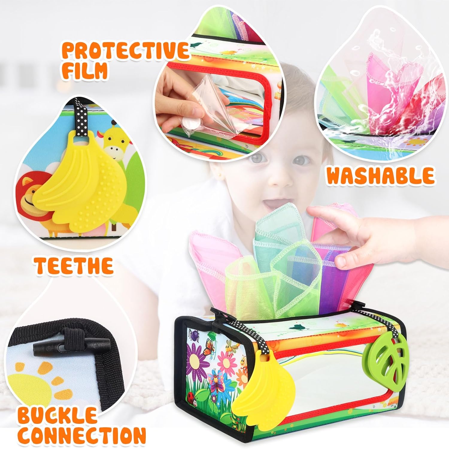 🧠【Newborn Toys 0-12 Months Brain Development】Our baby brain development toys includes a 2 in 1tummy time baby mirror tissue box, 2 teething toys, 10 crinkled tissues, 10 silk scarves, and a colorful exquisite box. The crinkled tissues have bright colors and crinkly sounds that can stimulate their visual and auditory development, and exercise their early brain development. In addition, teething toys can effectively relieve baby teething pain and prevent babies from sucking their fingers.