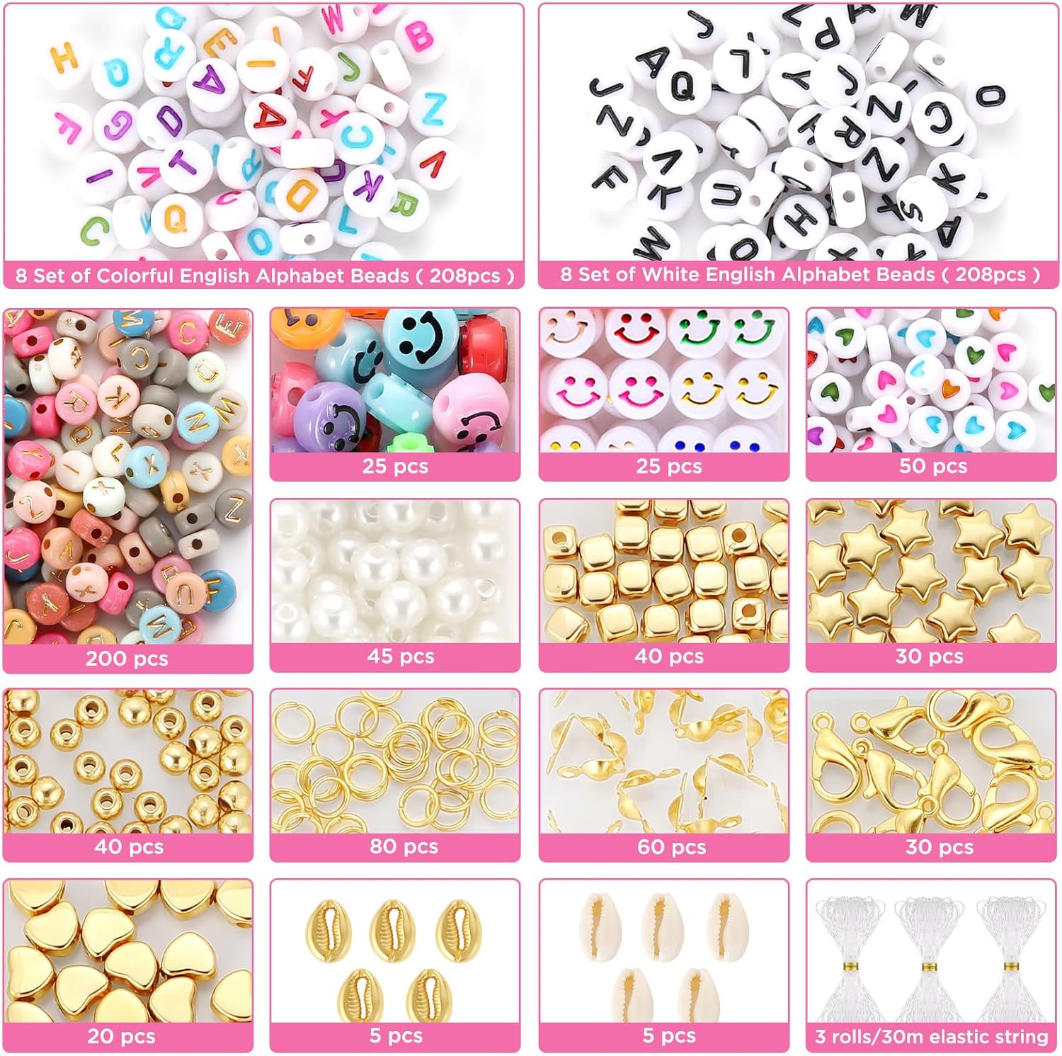 Great Value Set: Total of 5 boxes beads of jewelry making kit, including 48000+pcs 2mm seed beads, 616pcs letter beads, 50pcs smile face beads, 50pcs heart beads, 45pcs pearl beads, 310pcs metal charms kits, 3 rolls of elastic string (total length is 30m/98.4ft) and 1pcs gift box.