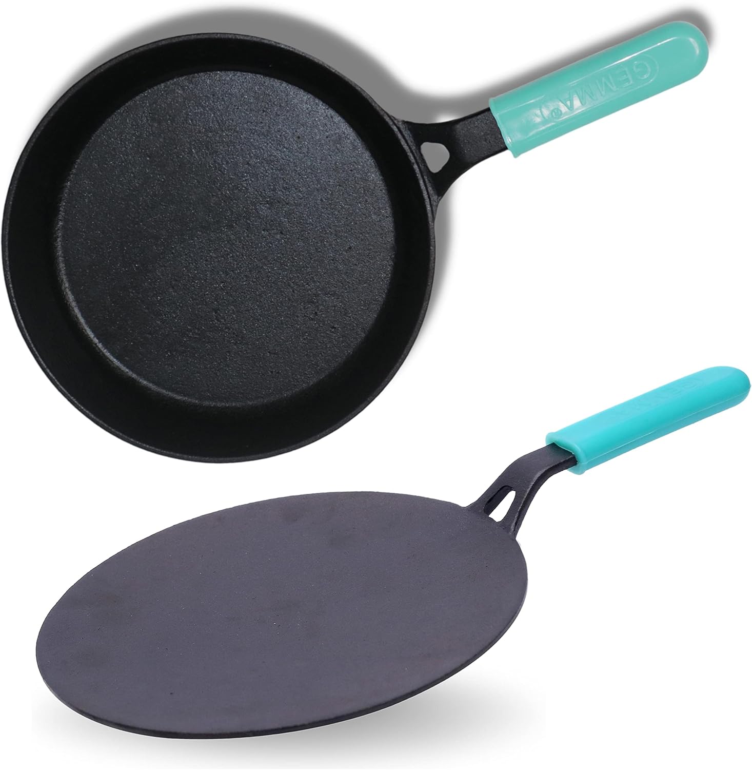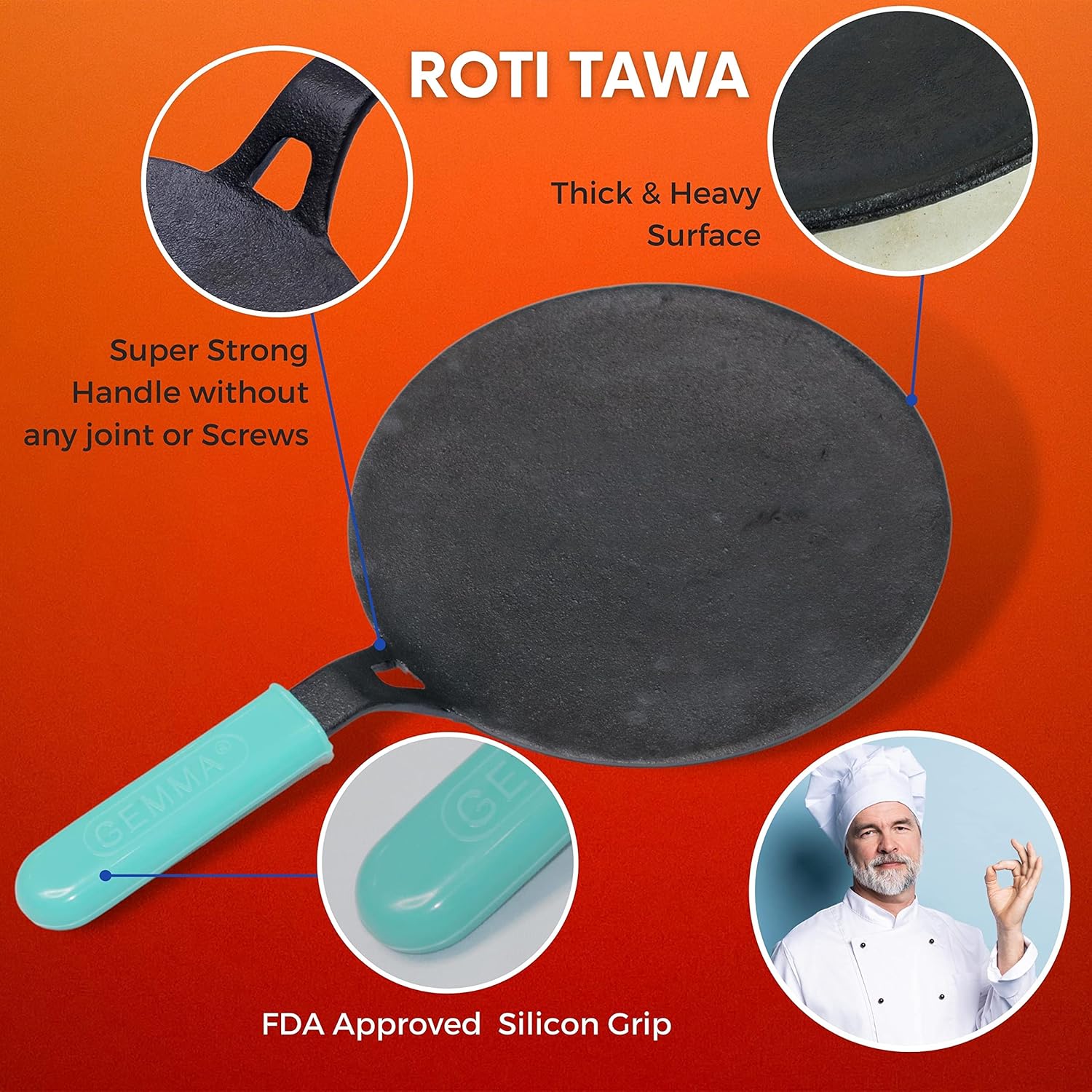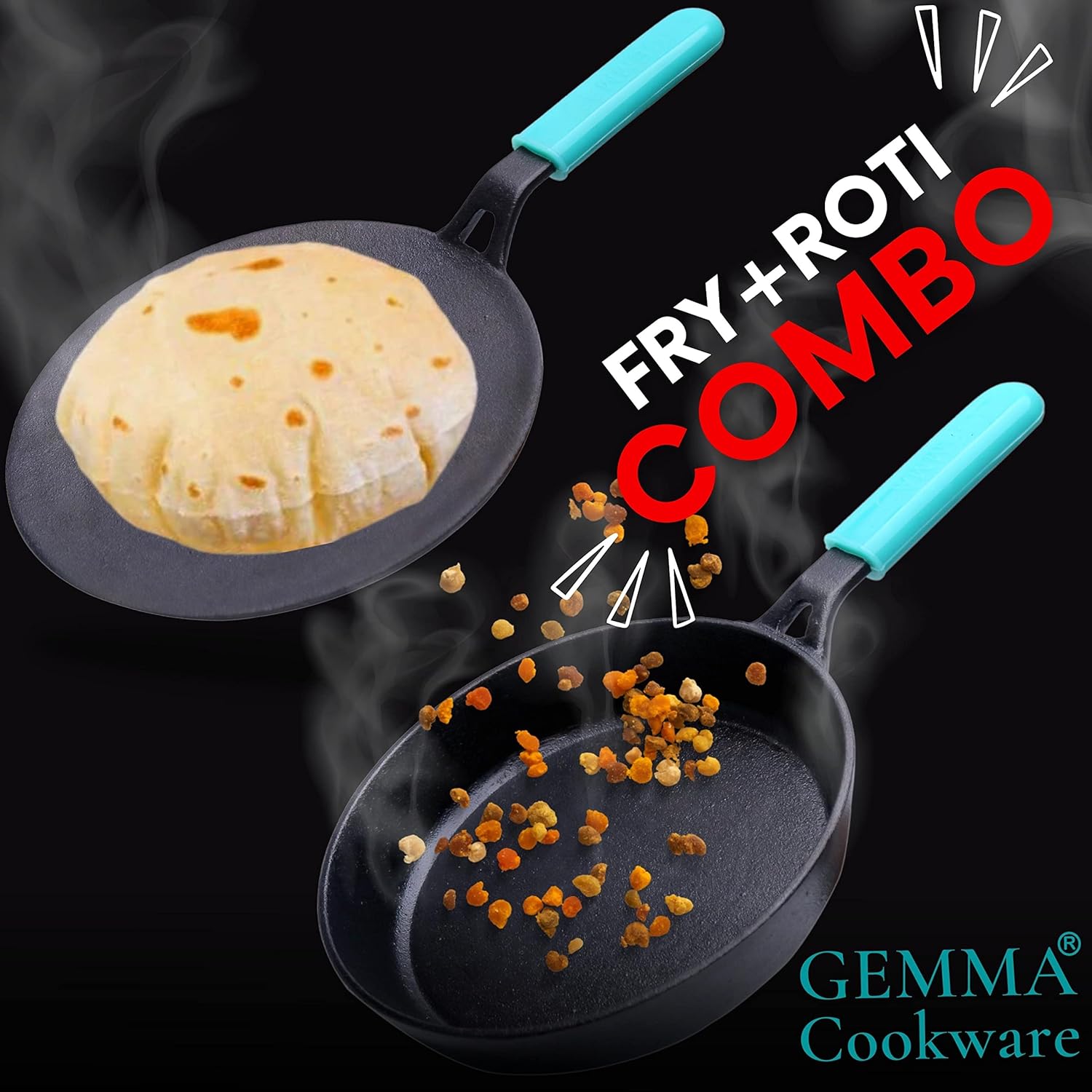 GEMMA Combo of 2, Nonstick Cast Iron Frying Pan for Cooking N Deep Frying with Concave Natural Non-Stick Pre-Seasoned Cast Iron Roti Tawa with Handle for Roti/Chapati/Paratha | Black
