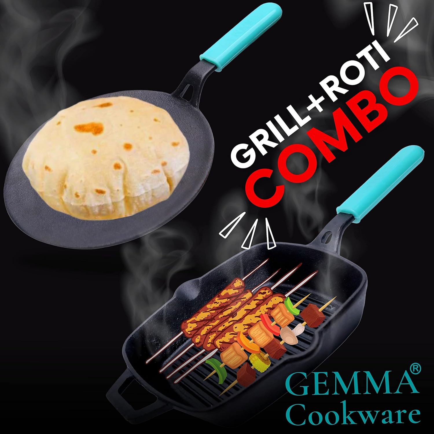 GEMMA Combo of 2, Pre-Seasoned Cast Iron Concave Natural Non-Stick Roti Chapati Tawa with Castiron Nonstick Cookware Grill Pan| Induction N Gas Friendly | Black