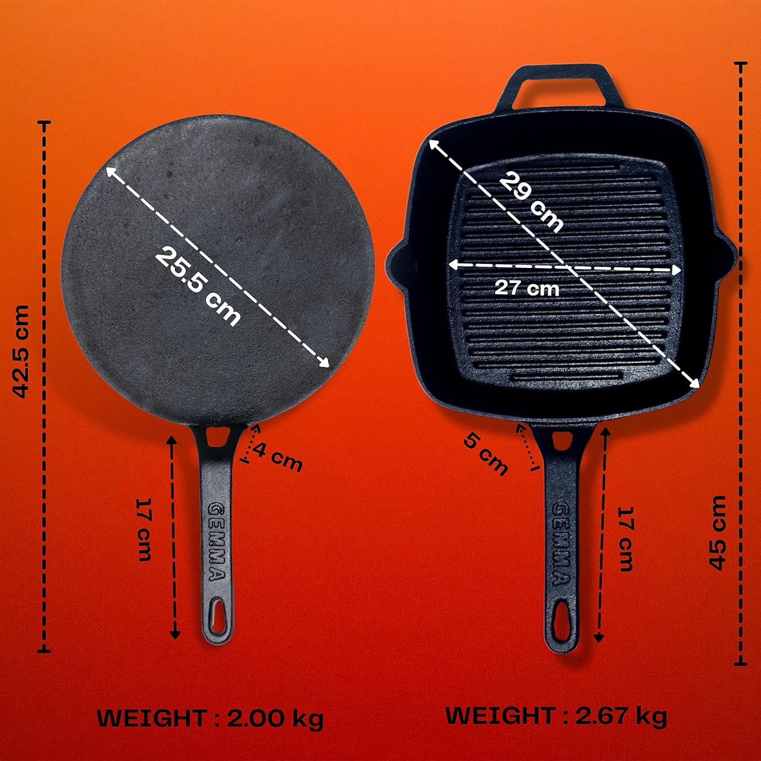 MATERIAL N QUALITY – Material Used Is Cast Iron Which Is Strong, Durable N Also Lasts Longer. Harder Than Any Other Material Heavy Gauge Iron Core Provides Even/Quick Heat Distribution. GEMMA Castiron Fry Pan And Frying Pans Are Made To Last A Lifetime