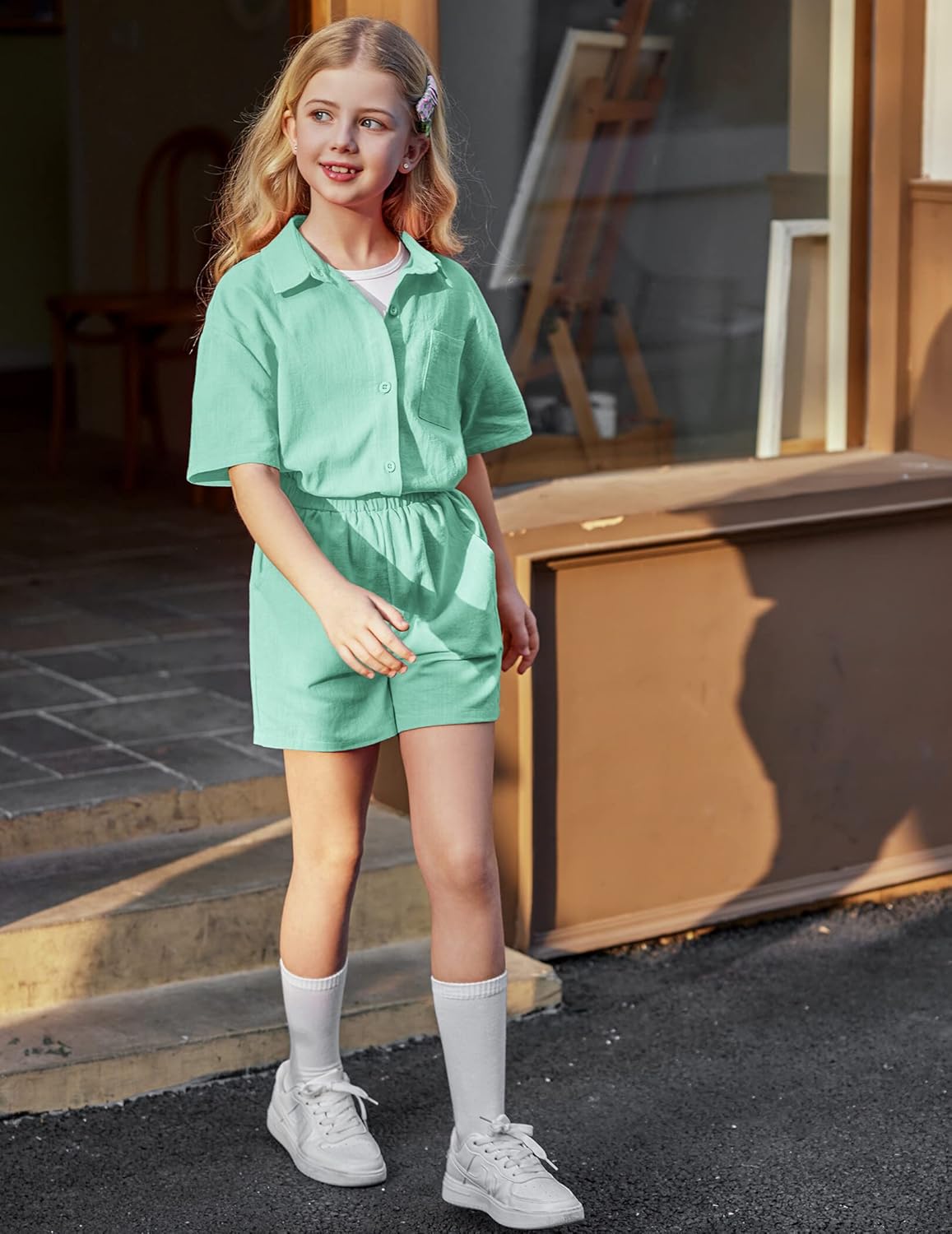 Girls 2 Piece Linen Set Kids Outfits Cotton Button Down Short Sleeve Collared Shirt Set 6-13 Years