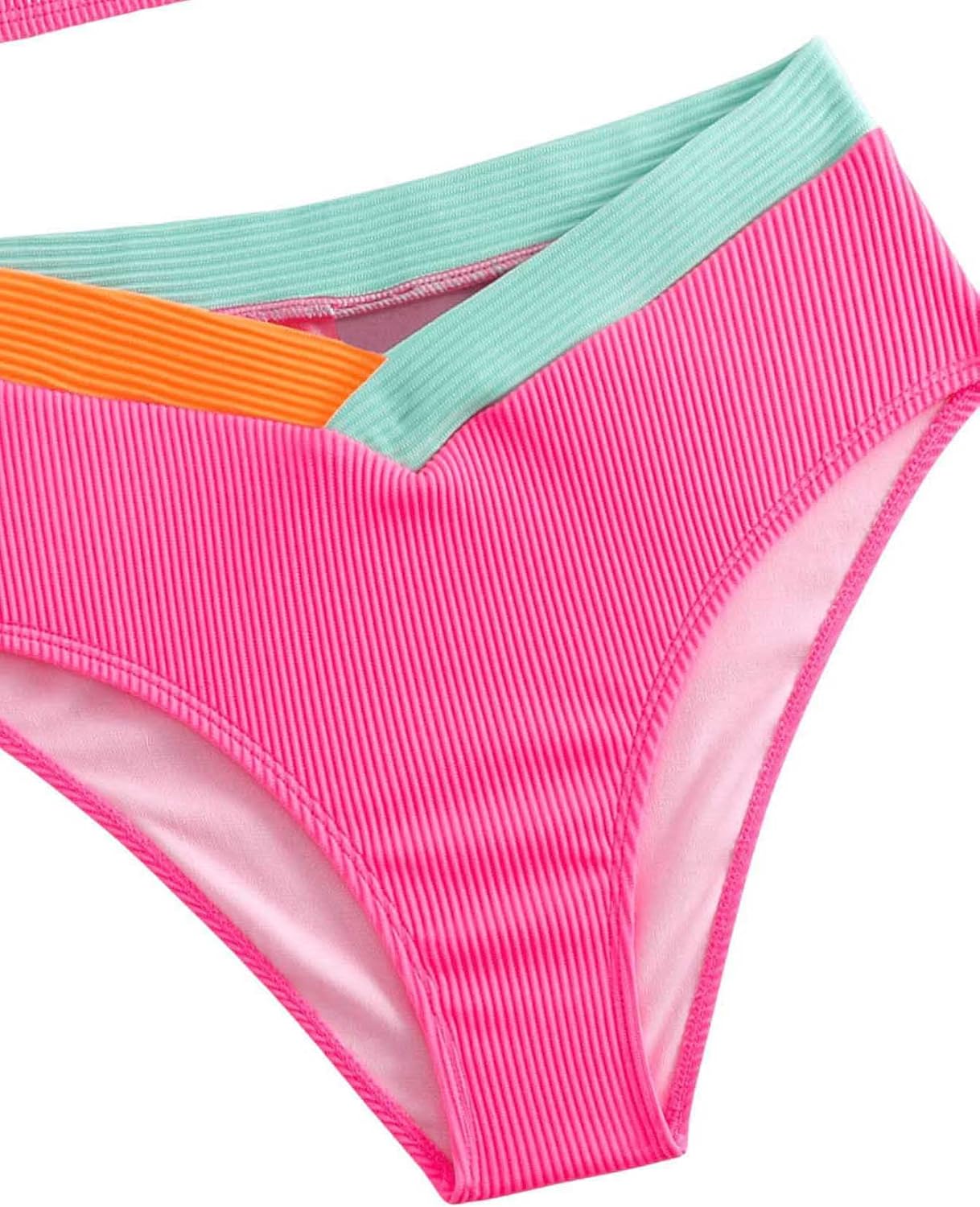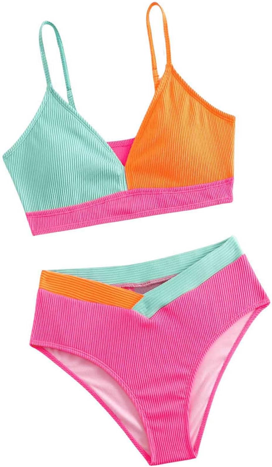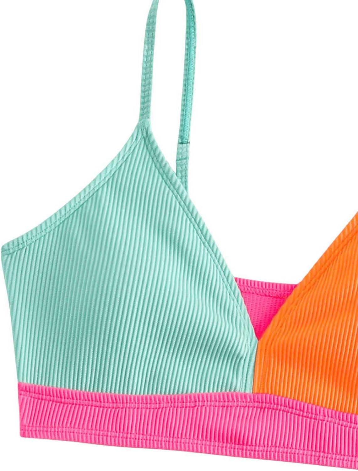 Girl’s 2 Piece Swimsuits Colorblock Ribbed Knit Wireless High Waisted Bikini Cute Bathing Suit