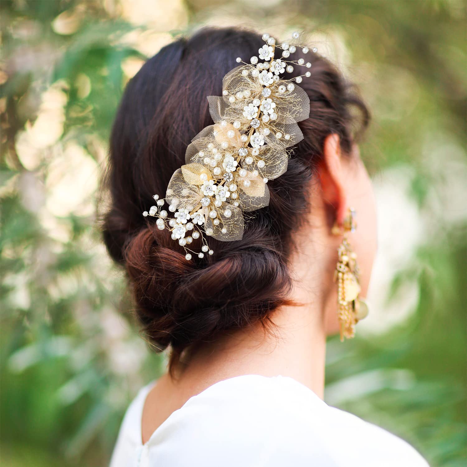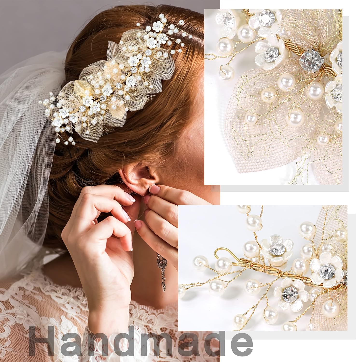 * Flower Wreath Material* Gold brass wire, Alloy, rhinestone, crystal, pearl. It is blendable so you can adjust it for any hair style design.