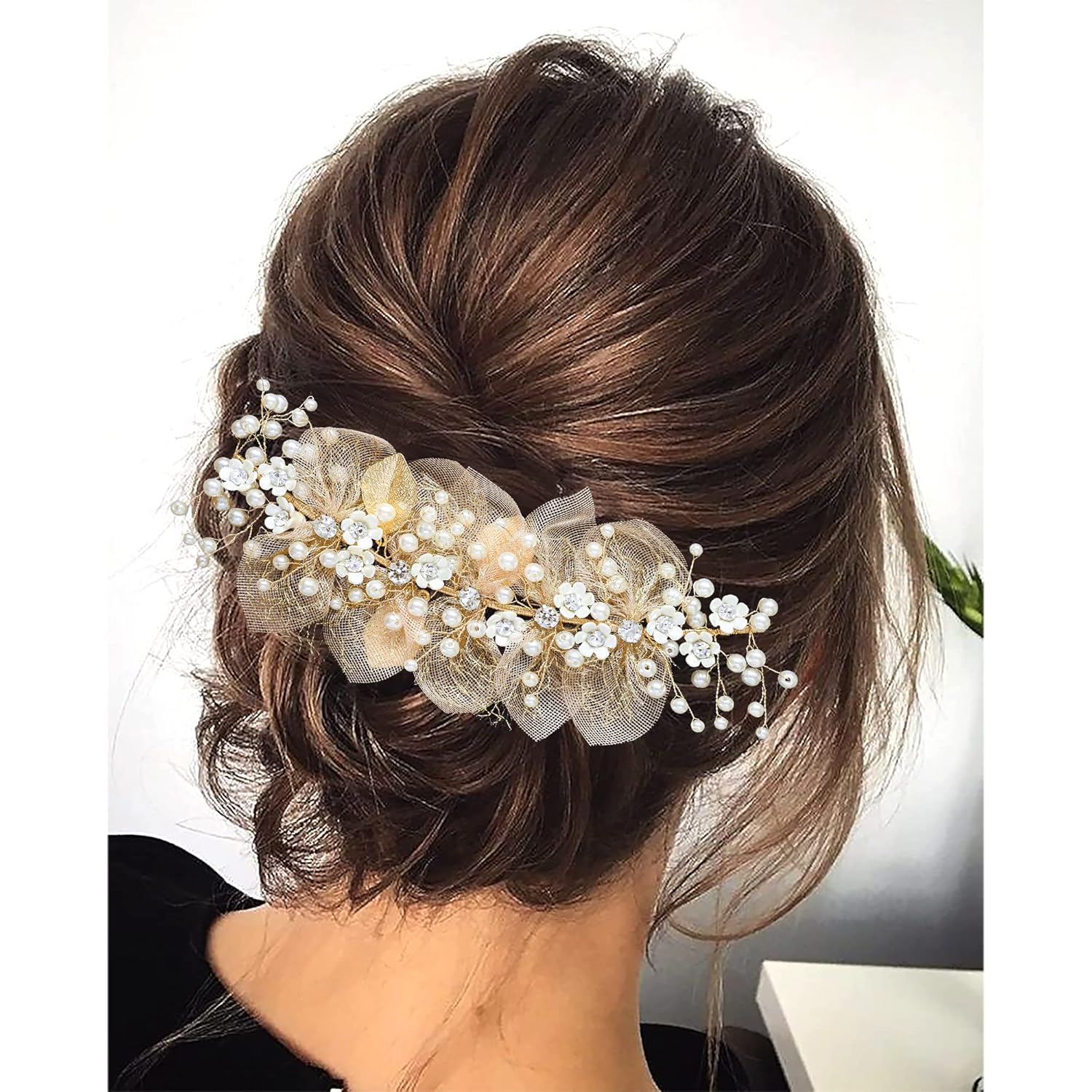 * Flower Wreath Material* Gold brass wire, Alloy, rhinestone, crystal, pearl. It is blendable so you can adjust it for any hair style design.