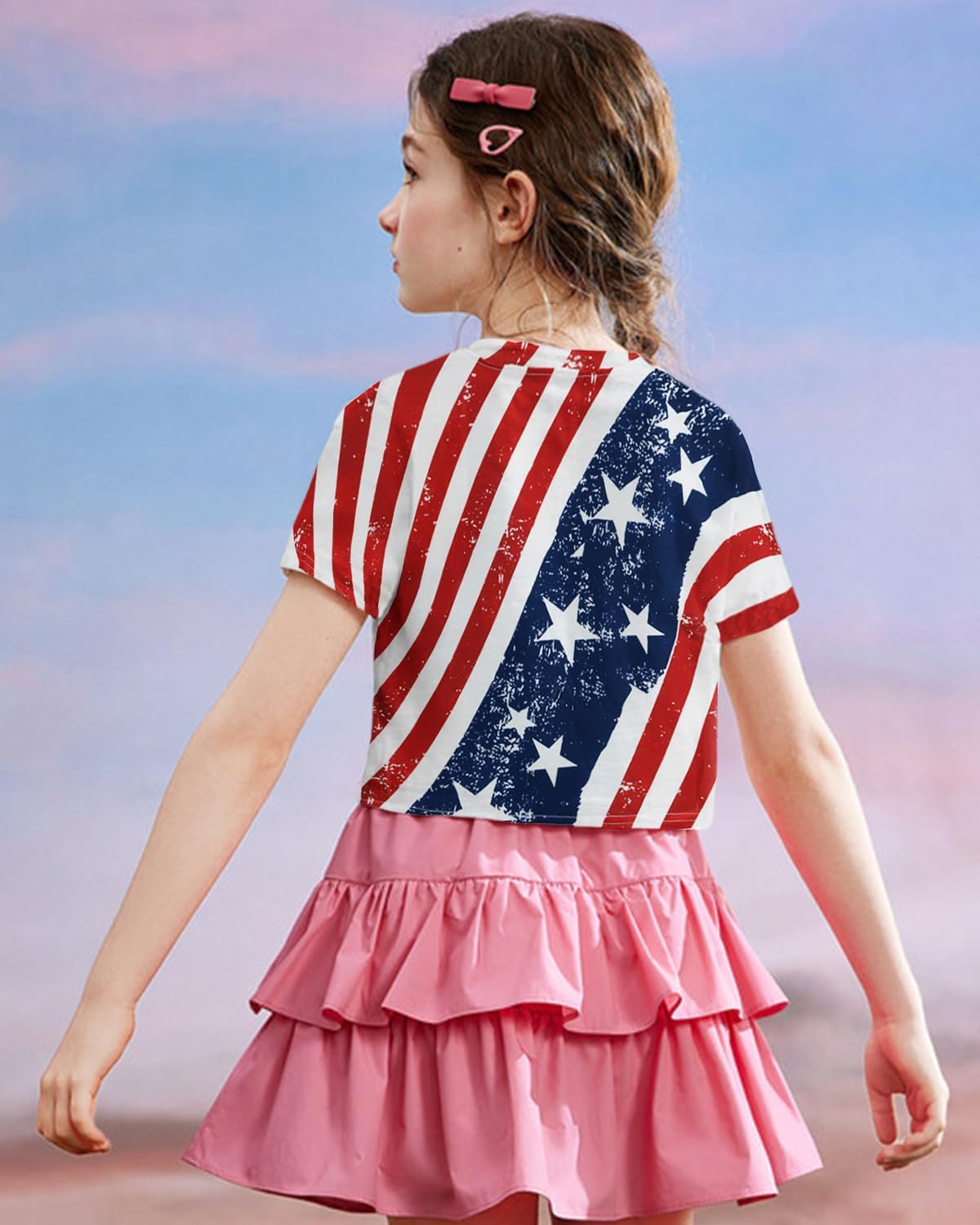 Girls July 4th Crop Tops Patriotic Shirt American Flag Short Sleeve Tshirts for Girl 6-14 Years