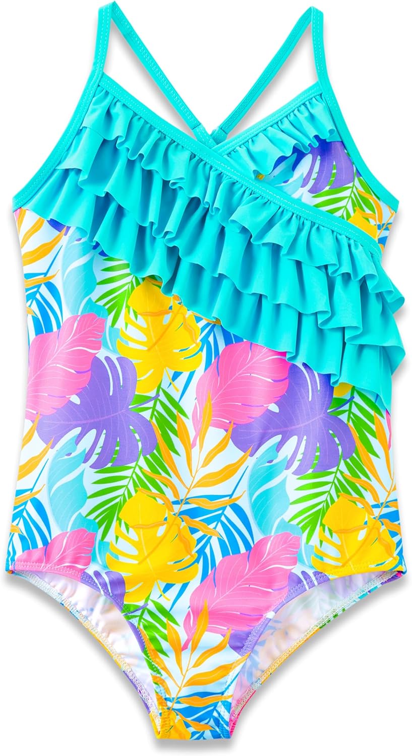 Your little one will feel like a mermaid on this cute girls’ sparkling scales graphic pattern one piece swimsuit. It also features a fun and colorful theme perfect for water-side photos. Plus, how sweet are these ruffles in front!