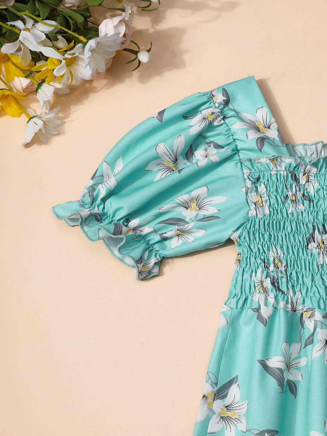 Loose Fit Design: Creates a unique sweet casual style.Square Neck: Making your girl look elegant and confident!Ruffle Puff Sleeves: There is no doubt that this must be for sweet girls!Elastic Fabric: Bring girls a happy and comfortable wearing experience.