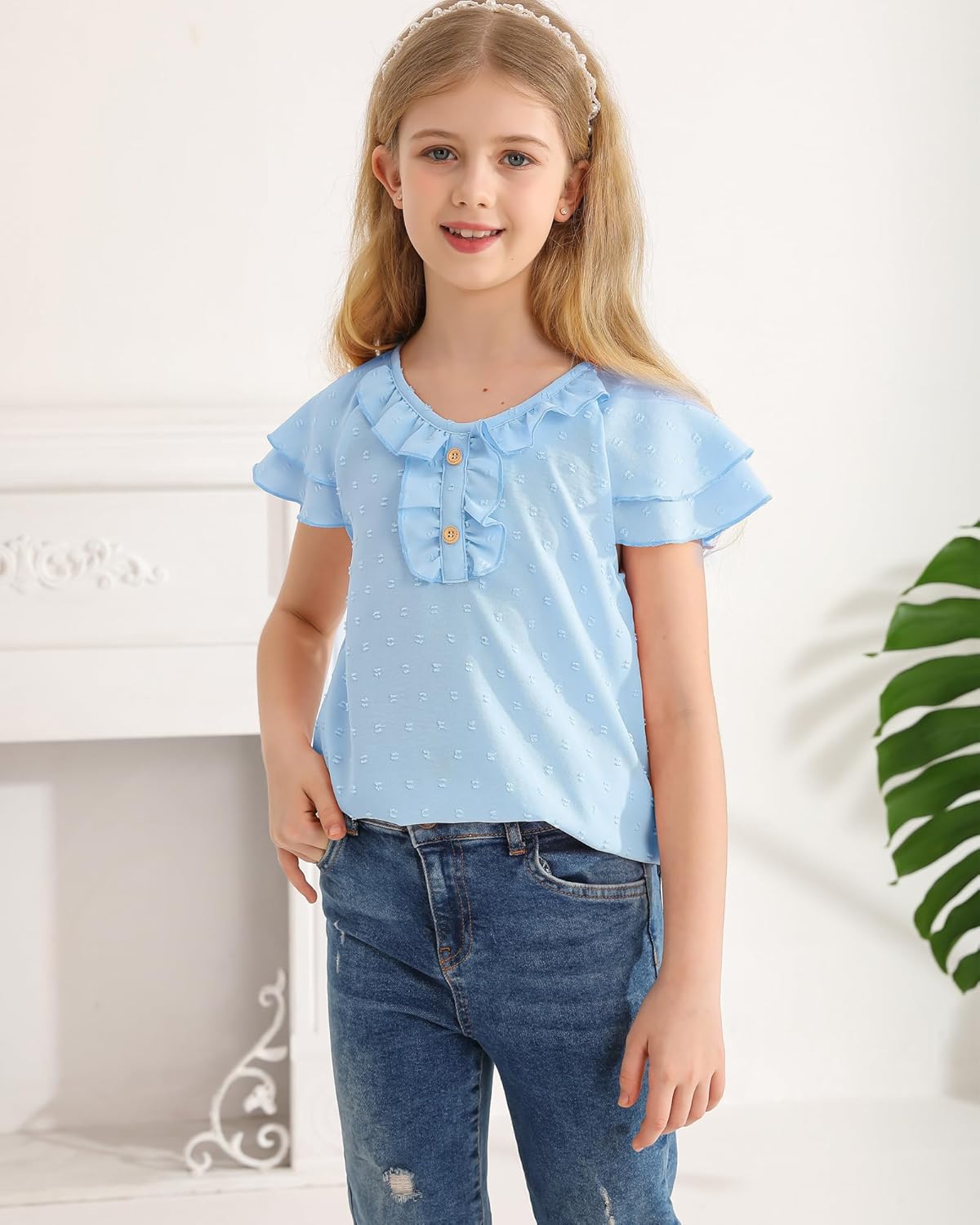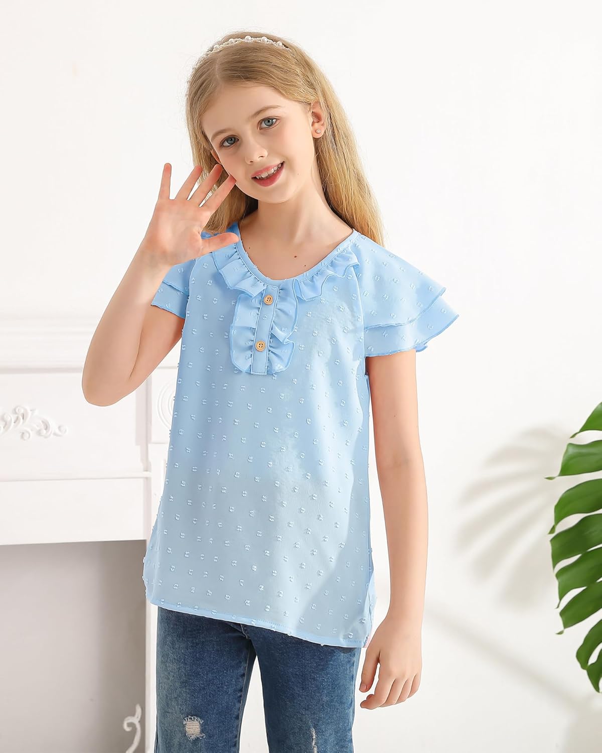 Girls Shirts V-Neck Ruffle Short Sleeve Summer Chiffon Blouses Casual Cute Swiss Dot Flowy Tee Tops 6-13Years