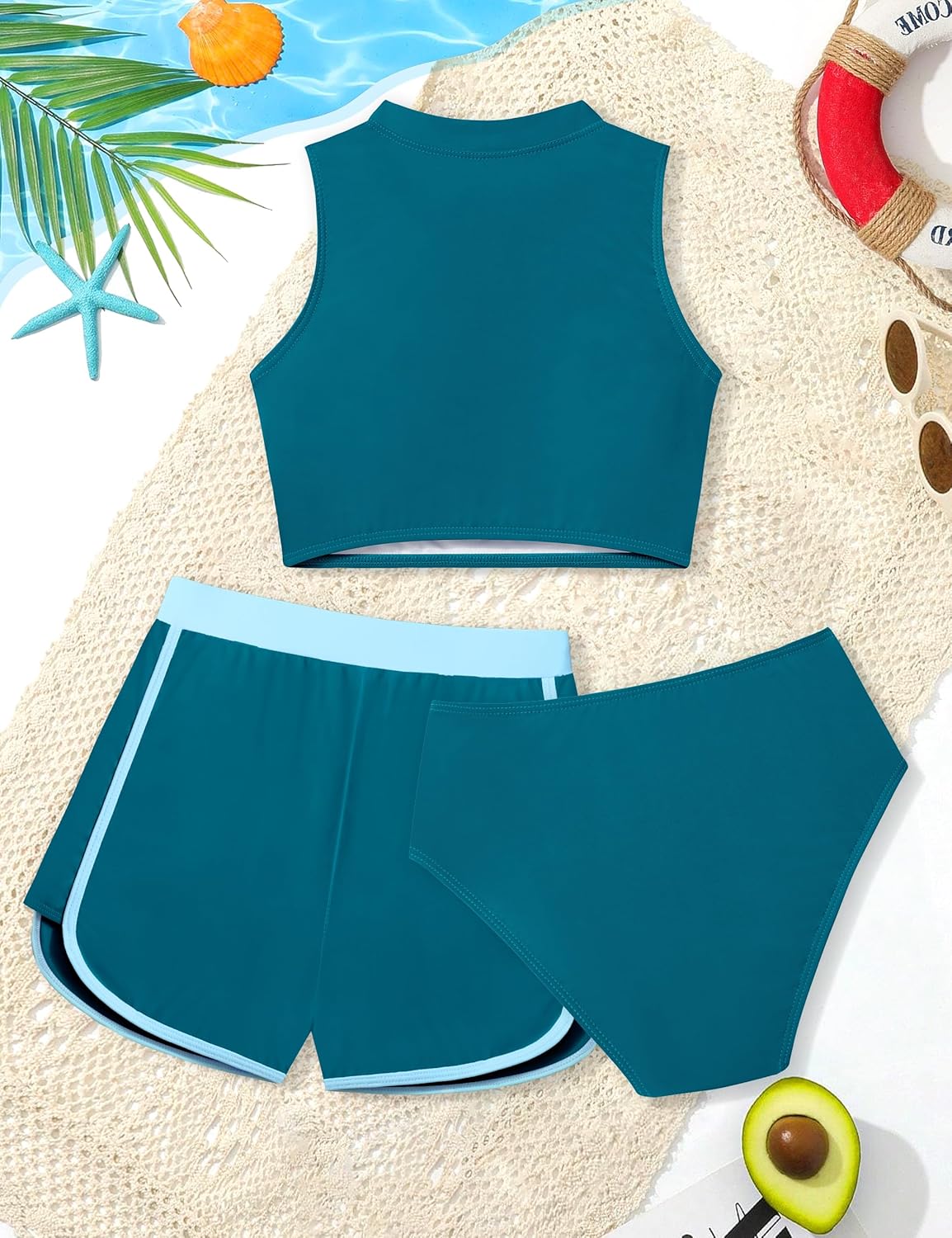 Girls Swimsuit 3 Piece Color Block Zipper Front Bathing Suit Bikini Set with Shorts 7-16 Years