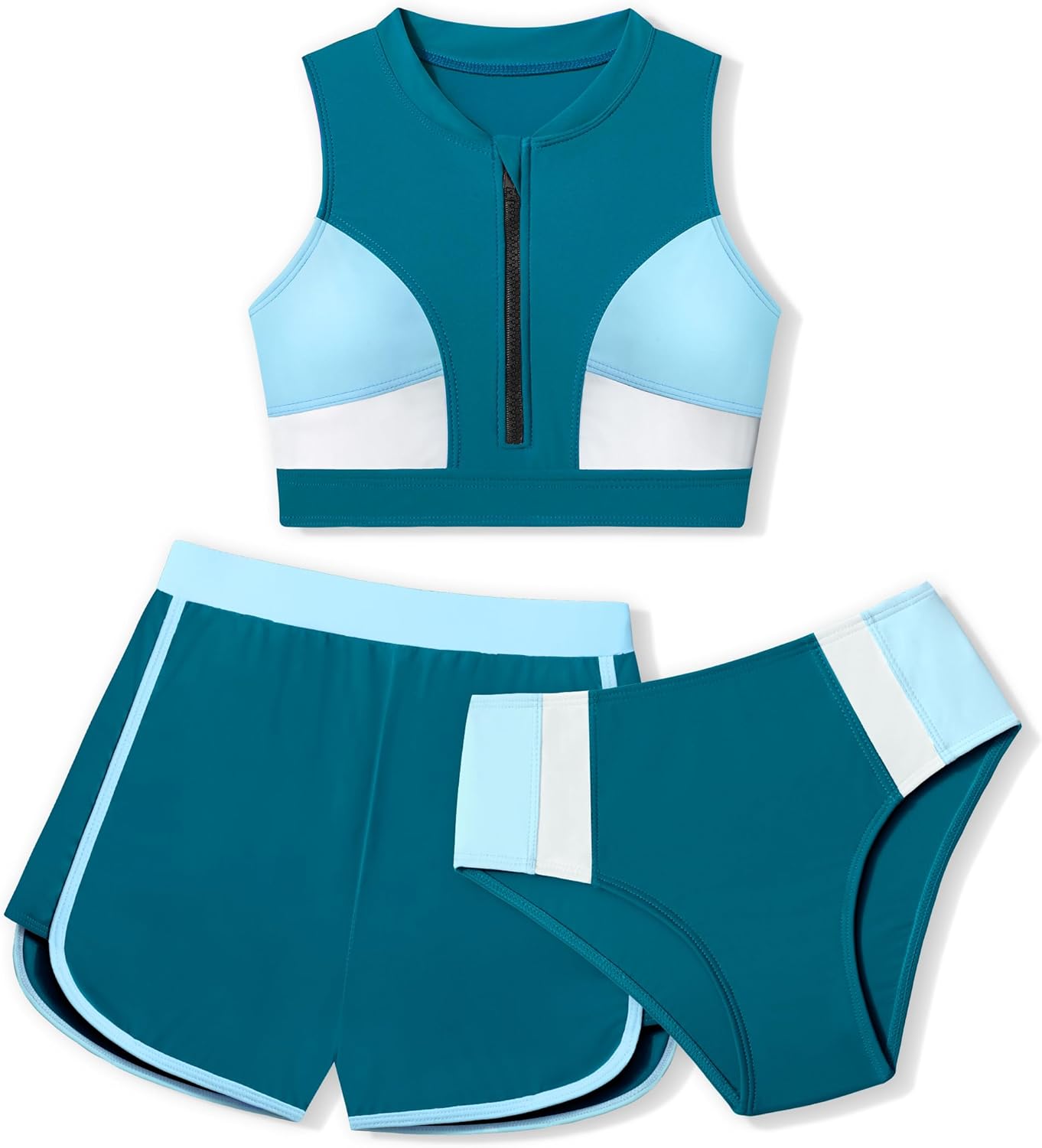 Girls Swimsuit 3 Piece Color Block Zipper Front Bathing Suit Bikini Set with Shorts 7-16 Years