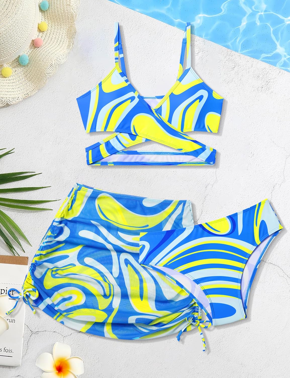 Girls Swimsuits 3 Piece Bathing Suit Allover Printed Criss Cross Bikini Set with Cover Up Skirt Beach Swimwear 7-14 Years