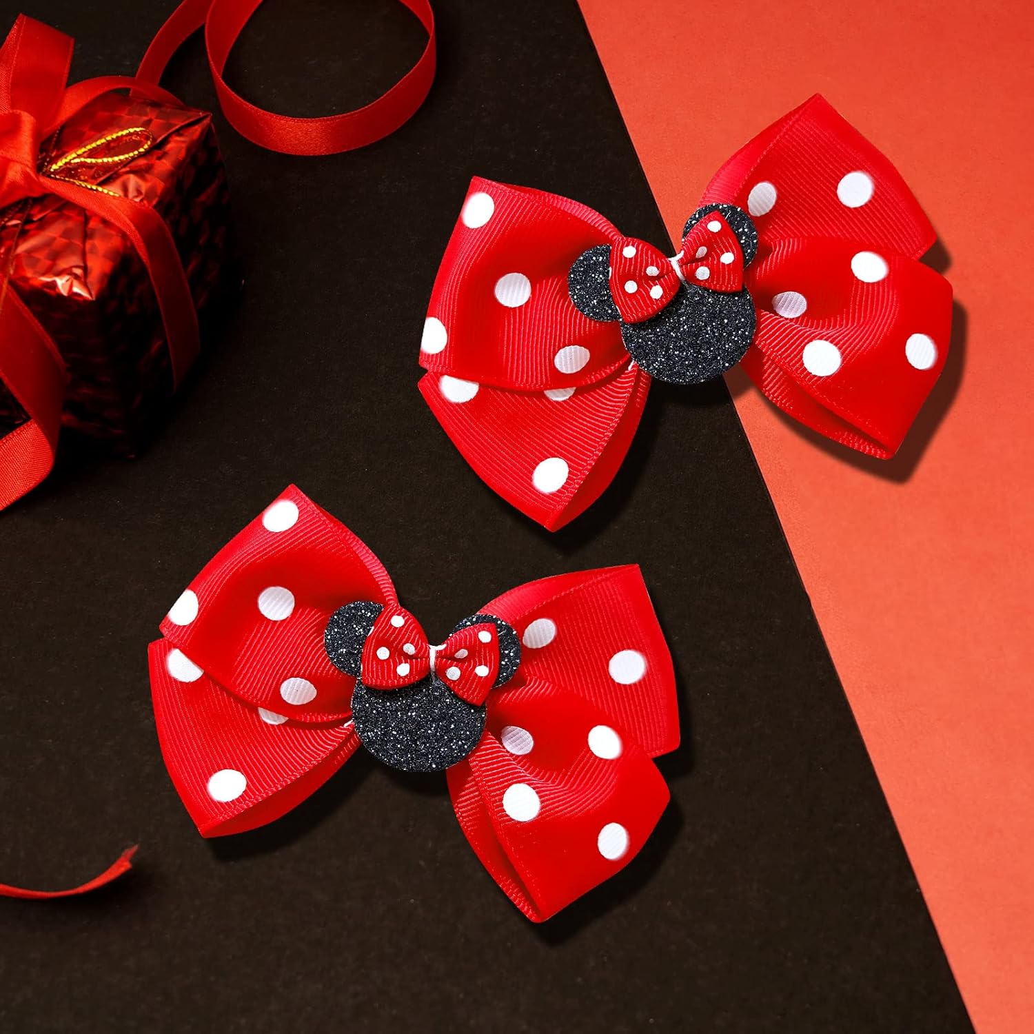 Glitter Mouse Ears Birthday Hair Bow Clips Toddler Baby Girls Red Polka Dot Pigtail Bows Alligator Barrettes Kids Valentines Party Favor Dress up Cartoon Decor Accessory Cute Xmas Holiday Gift