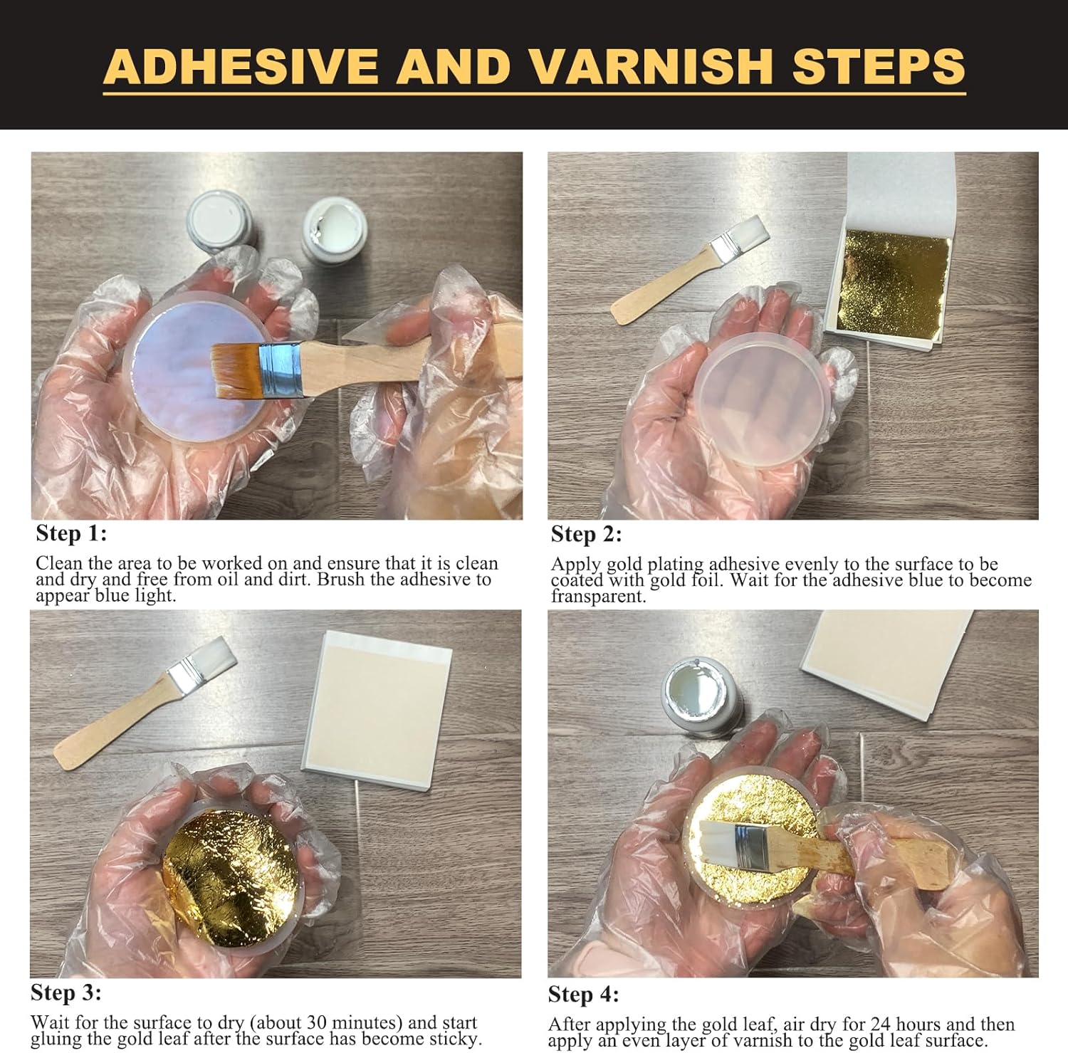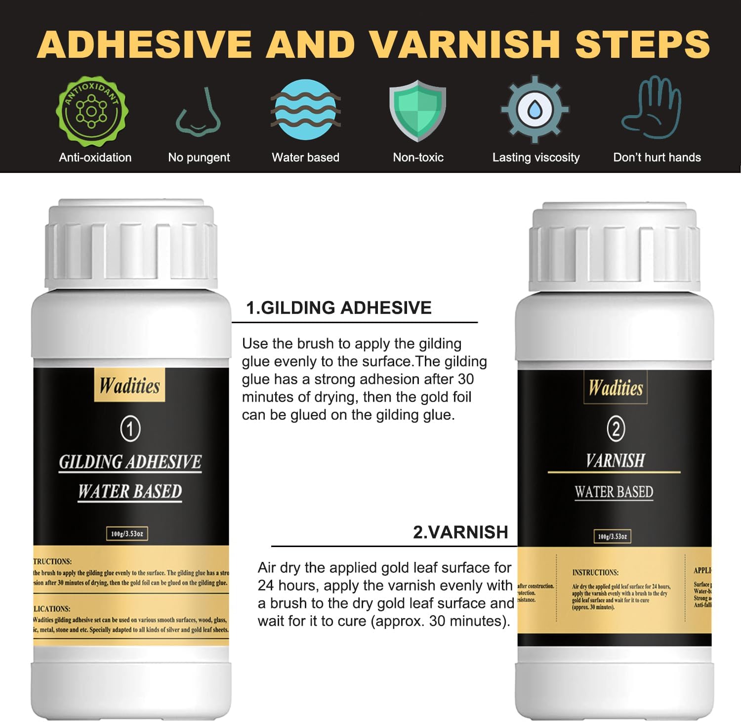 [Gilding Adhesive Set]:Gilding kit contains one bottle of 100ml gold leaf glue, one bottle of 100ml water-based varnish, 100 pieces of gold leaf and 2 brushes.