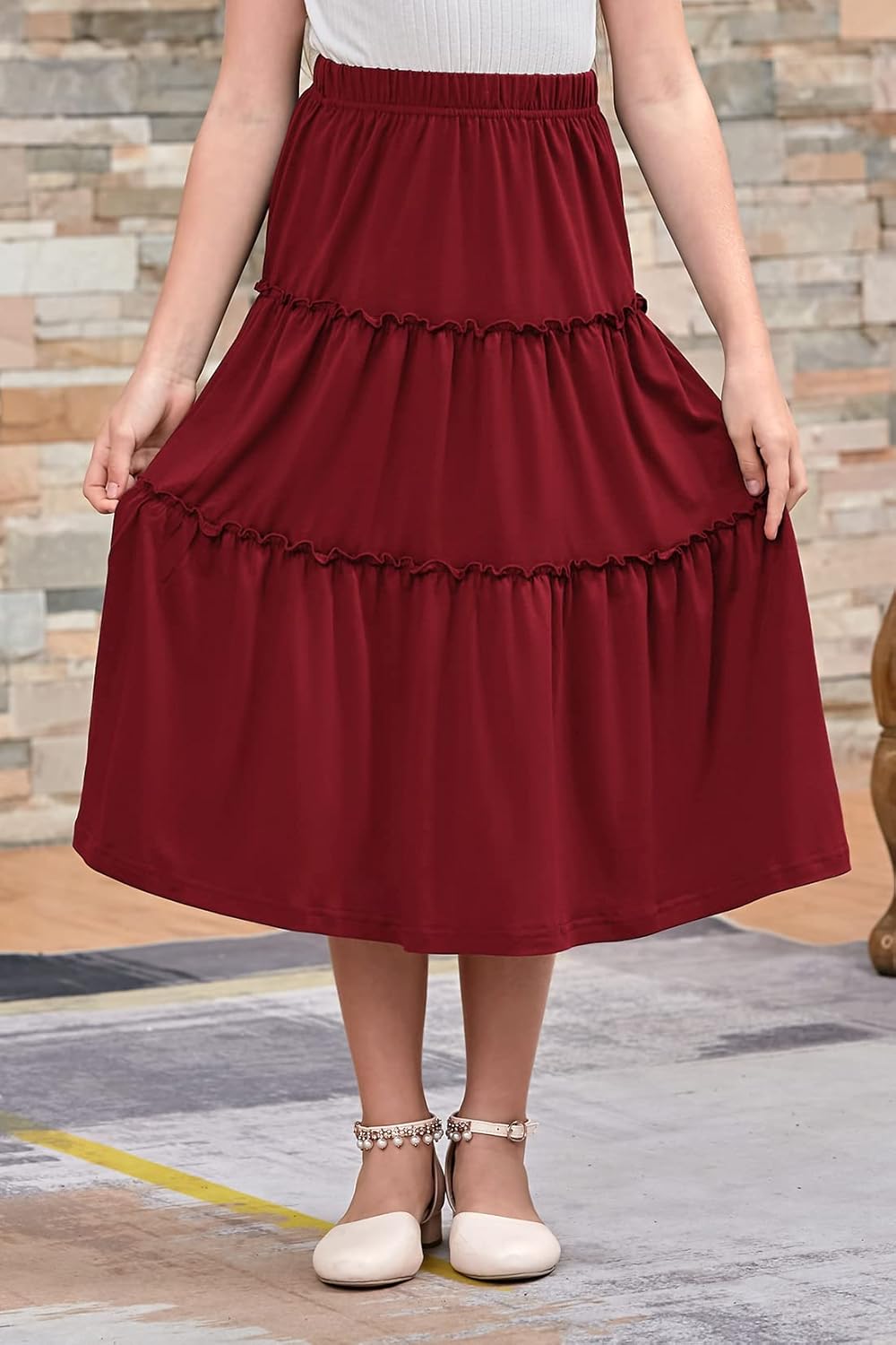 GORLYA Girls Boho Casual Elastic High Waist Tiered Ruffle Hem Long Swing Maxi Skirt 4-14T