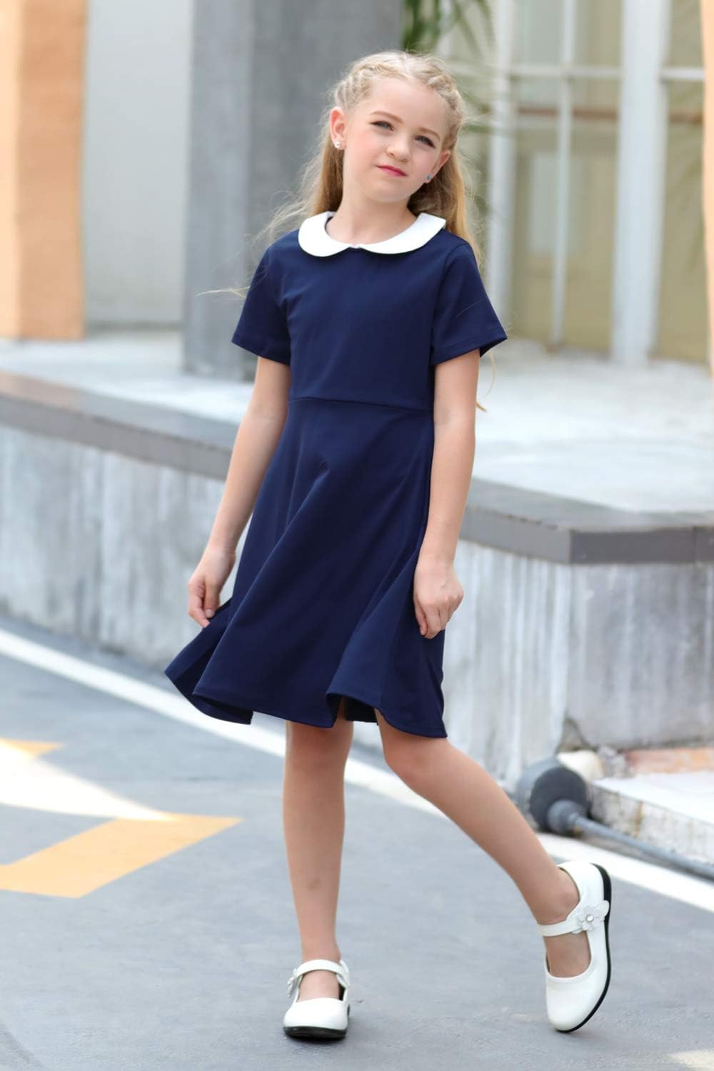 GORLYA Girl’s Short Sleeve Casual Vintage Peter Pan Collar Fit and Flare Skater Party Dress with Pockets 4-12 Years