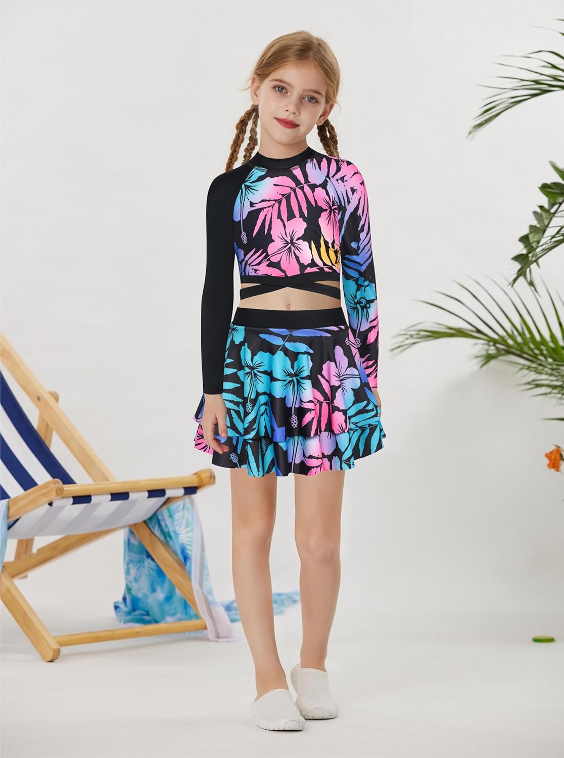 Girls Long Sleeve Swimsuit Cross Skirt Short Size 5-12
