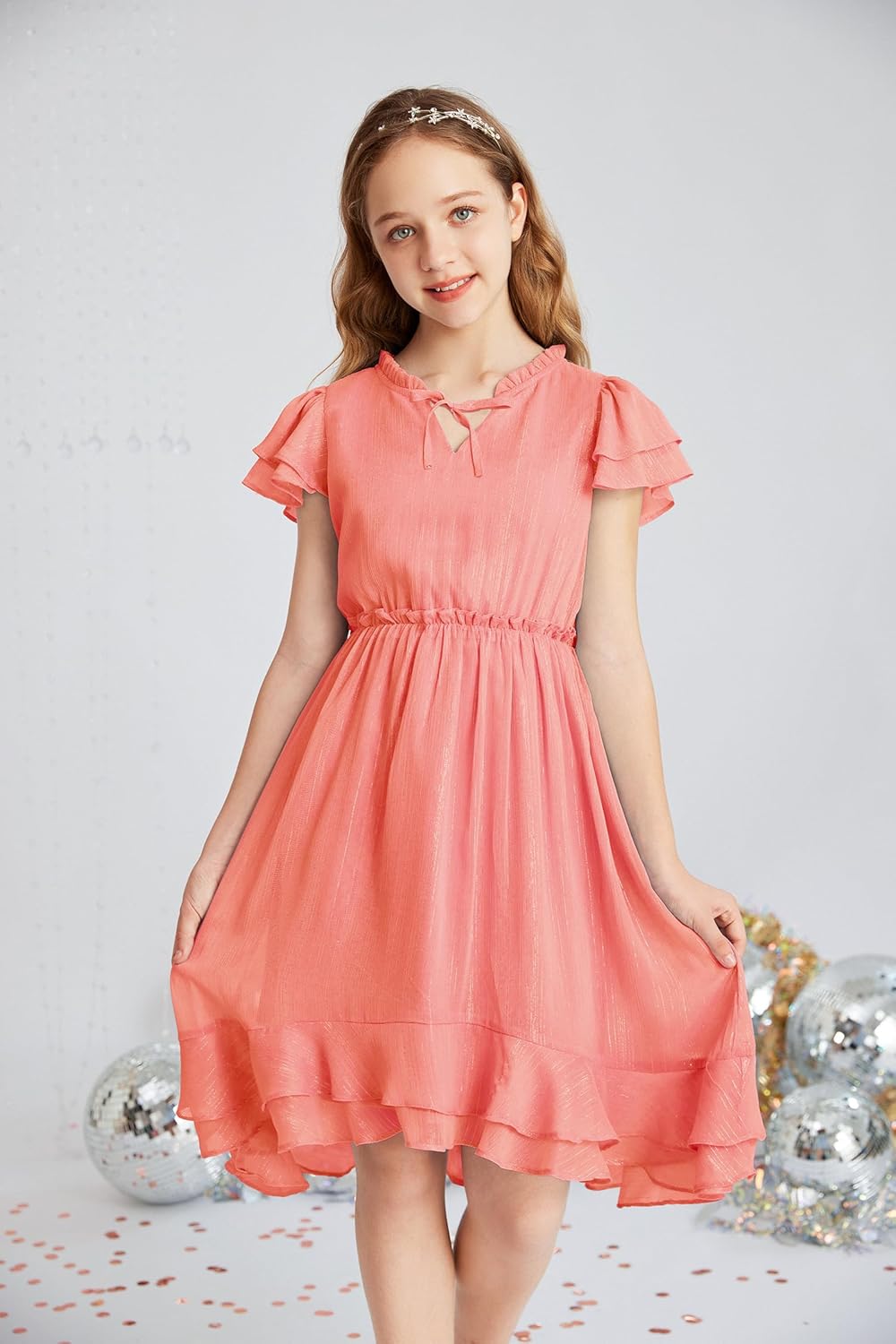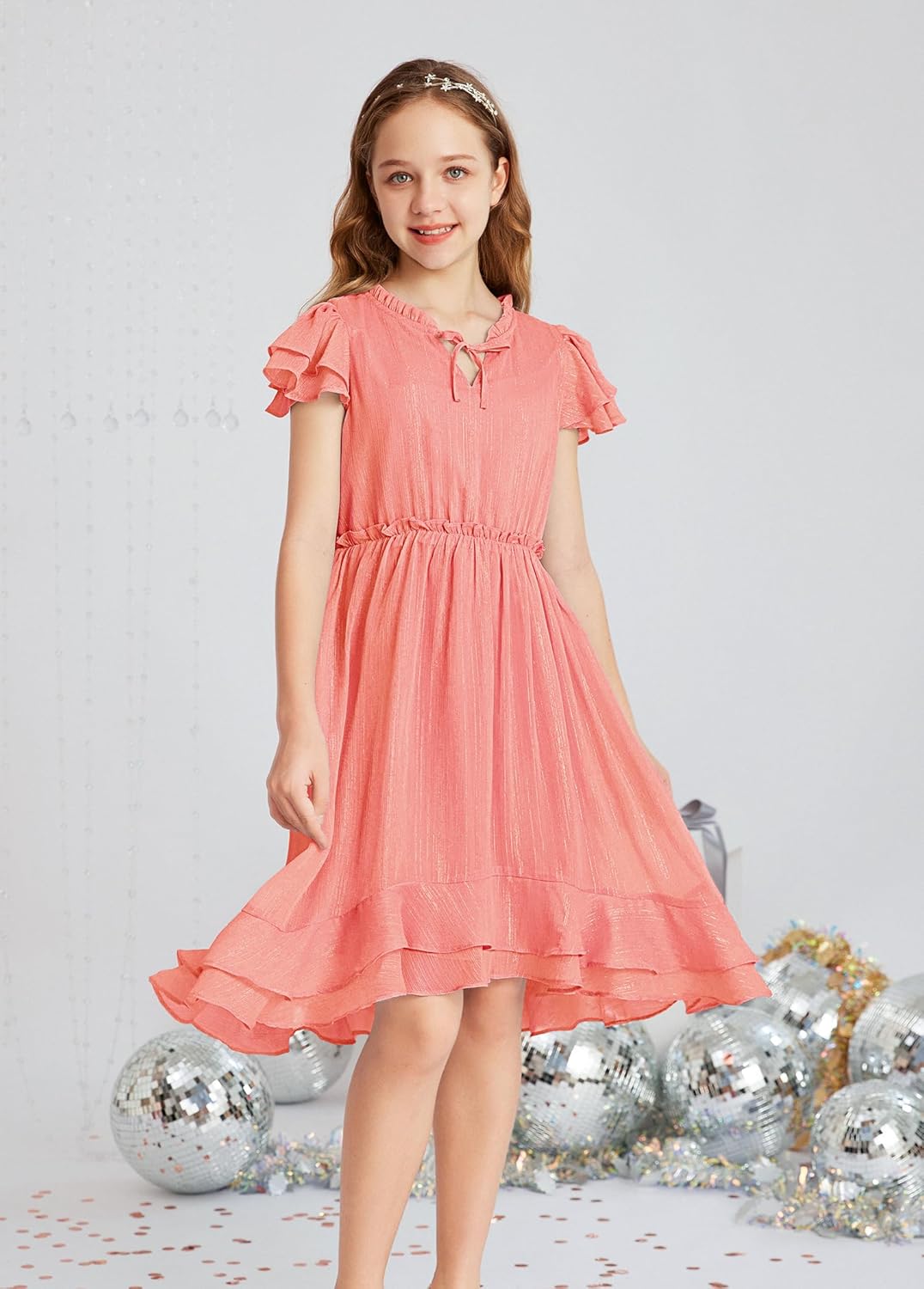 Girls Summer Ruffle Sleeve Casual Tie Neck Princess Cute Girl Dresses