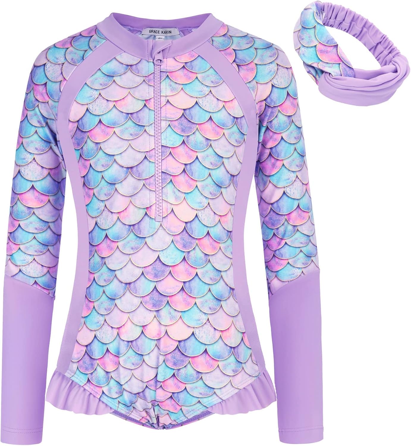 GRACE KARIN Girls One Piece Rash Guard Long Sleeve Bathing Suit with Hairband