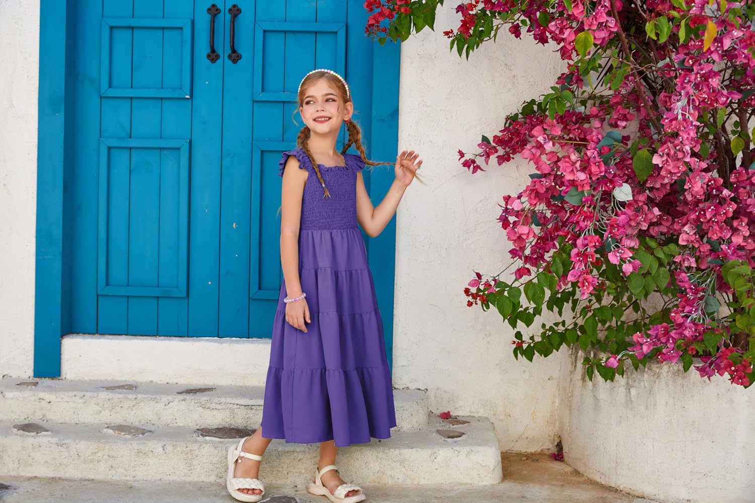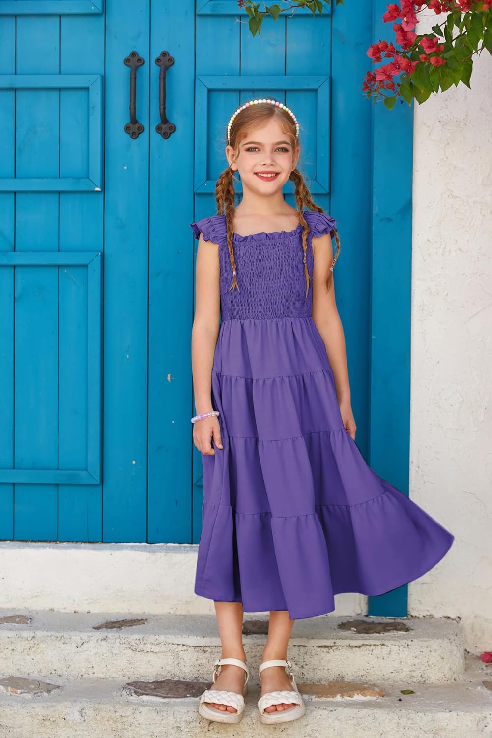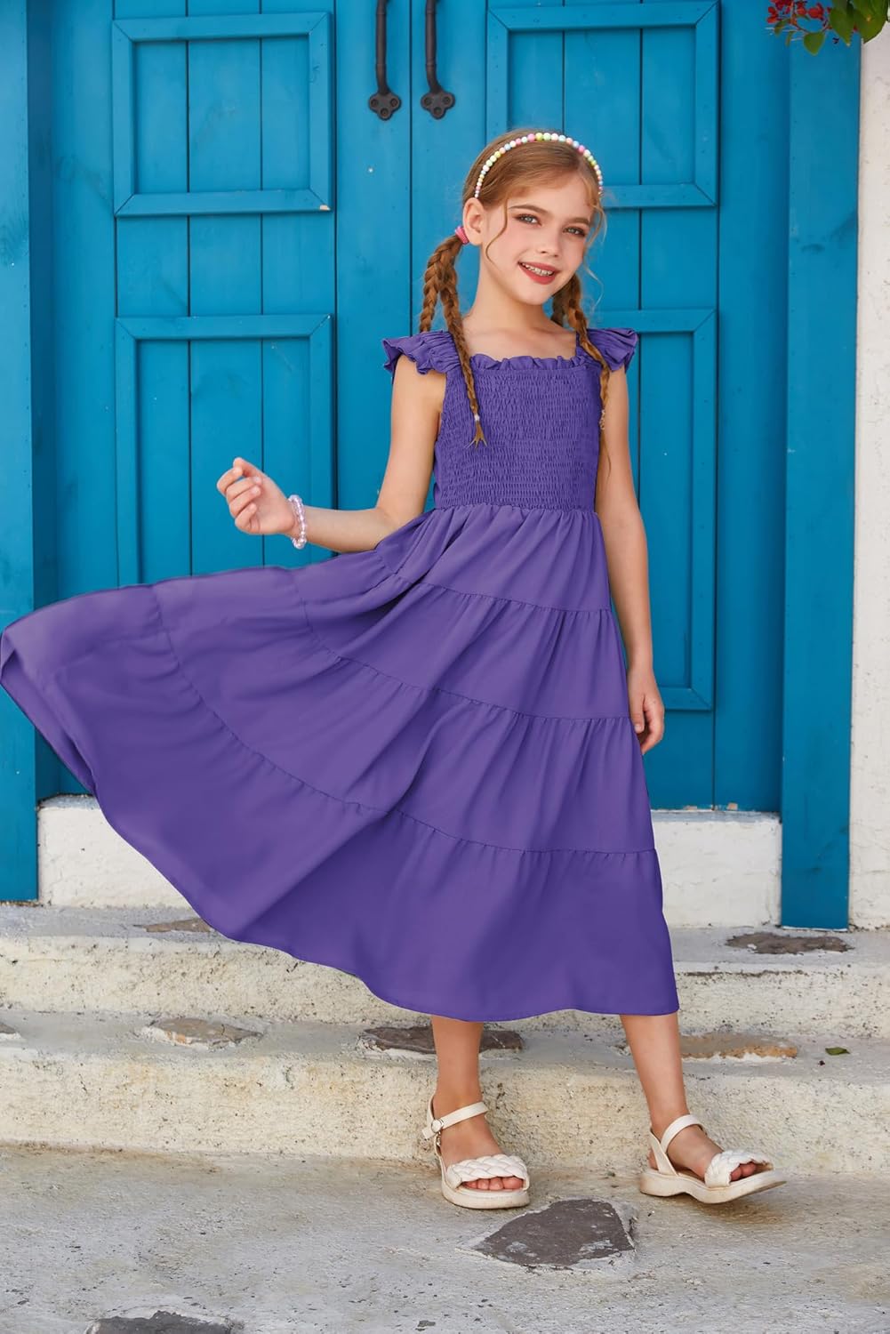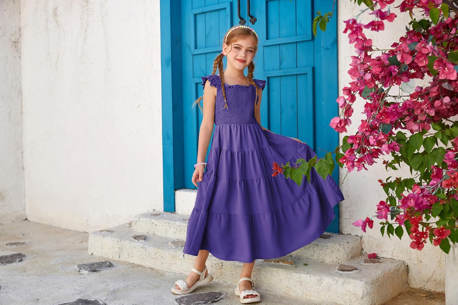 GRACE KARIN Girls Tie Back Party Dress Ruffle Sleeve Smoke Tiered Special Occasions Summer Maxi Dresses Size 5-12