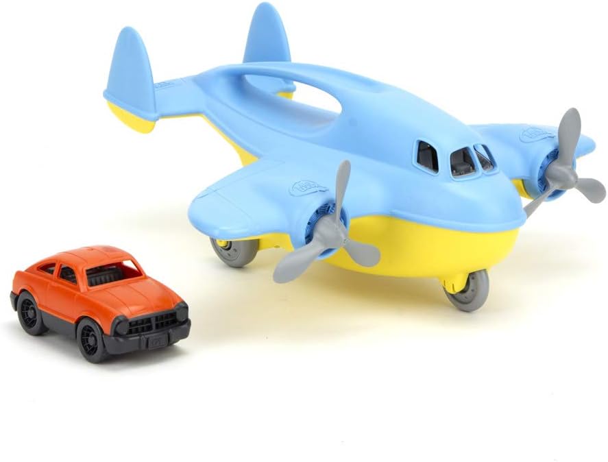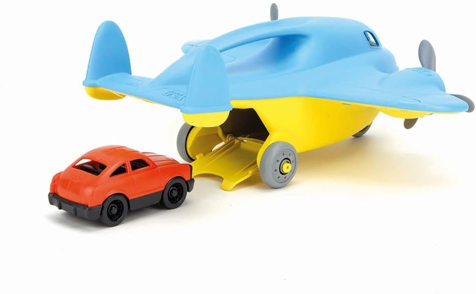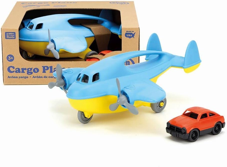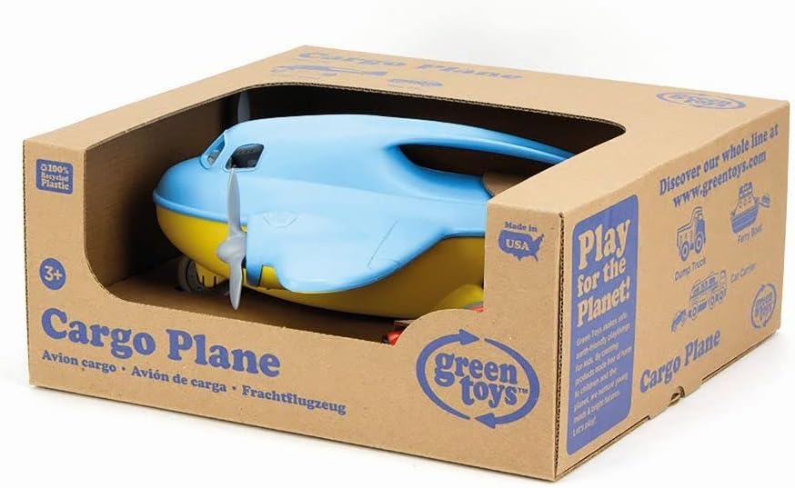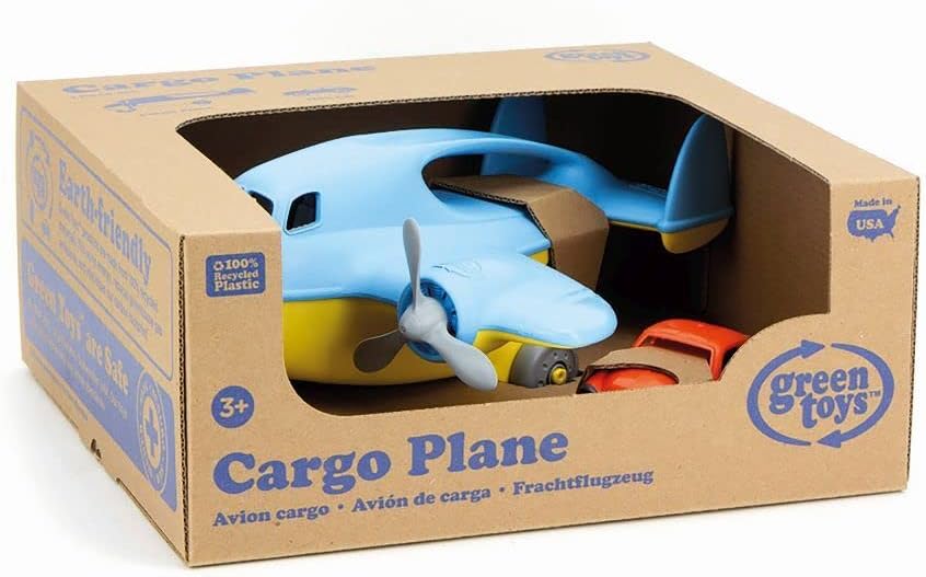 All systems go! The Green Toys™ Cargo Plane is filled with freight and ready to take flight! This bright yellow and blue flier features a three-wheel design and handle on the body, so little pilots can easily go from taxiing on the ground to soaring in the sky on an eco-friendly adventure. Access the spacious cargo hold through a flip-down door that doubles as a ramp, perfect for loading up the included Green Toys™ Mini Car or anything else imaginations want to stow away. Great for indoor and outdoor play, the super-safe design has no metal axels or exterior paints or coatings. Made in the USA from 100% recycled plastic with no BPA, phthalates, or PVC. Packaged with recycled and recyclable materials printed with eco-friendly inks