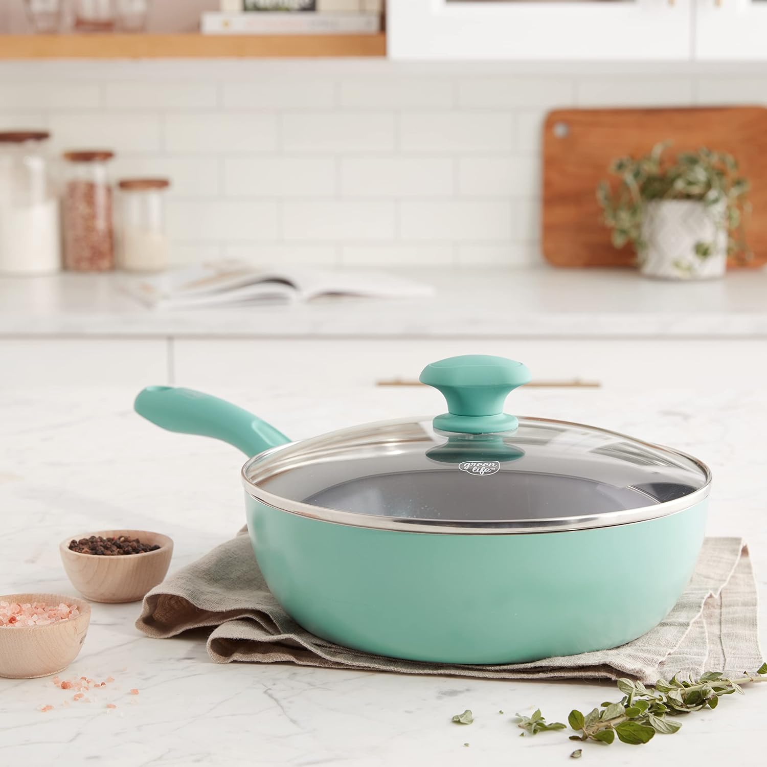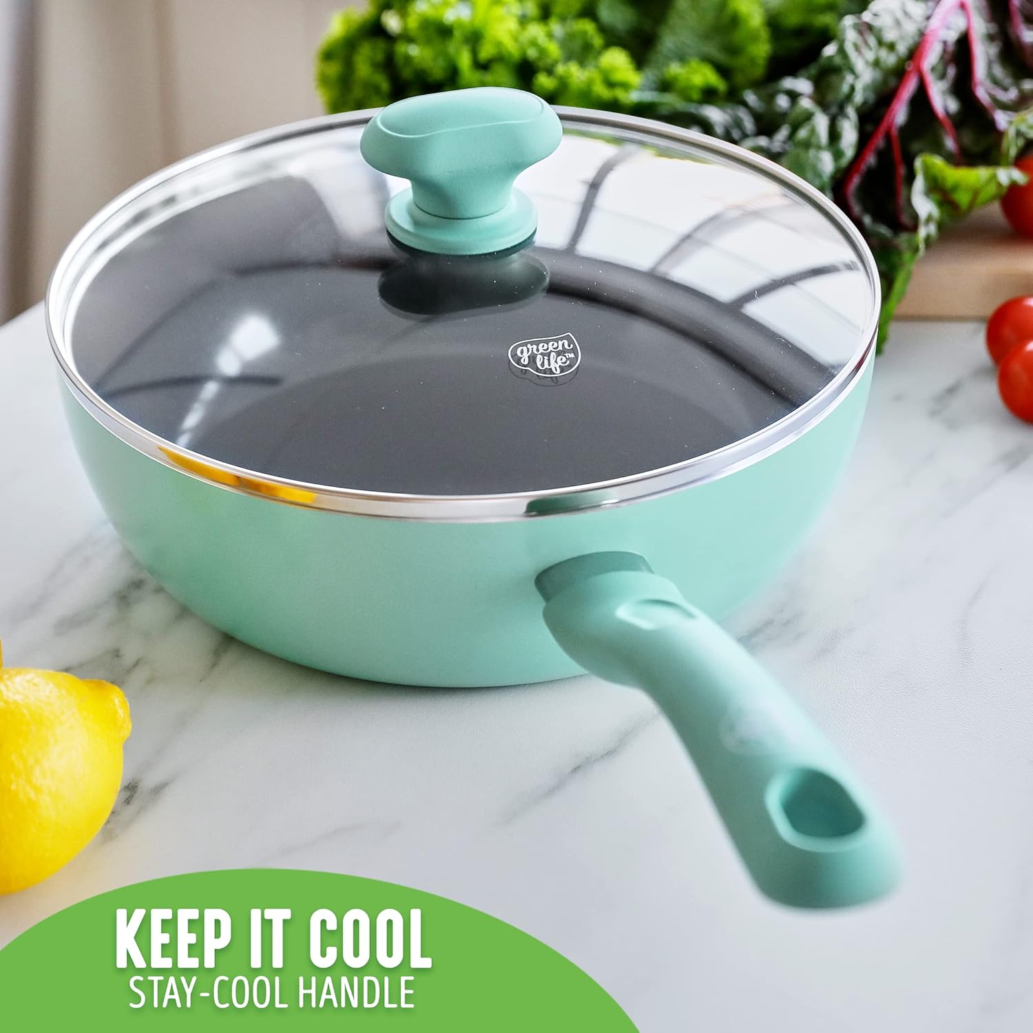 Be the first to review “GreenLife Soft Grip Diamond Healthy Ceramic Nonstick, 3QT Chef Saute Pan with Lid, PFAS-Free, Dishwasher Safe, Turquoise”